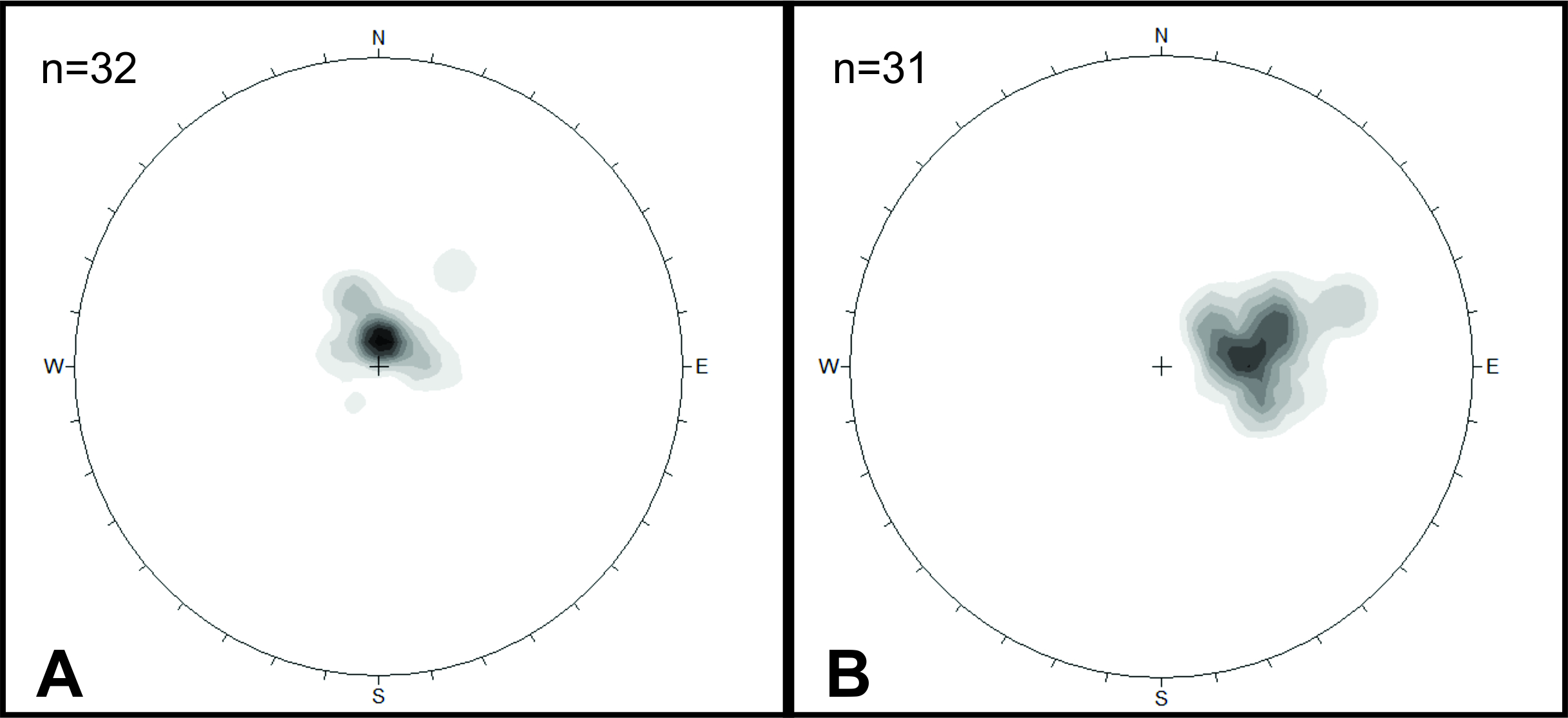 En la estación 1, esta lineación revela un buzamiento preferente hacia el noroeste y cercano a la vertical, con una concentración máxima en la dirección N20O/79NO (Fig. 7A). En la estación 2, a diferencia de la anterior, la lineación presenta un buzamiento preferencial hacia el noreste, con una concentración máxima en la dirección N79E/55NE (Fig. 7B). La rotación dextral de la lineación en la estación 2 respecto de la estación 1 se debe a la inflexión en el mismo sentido de la foliación magmática.