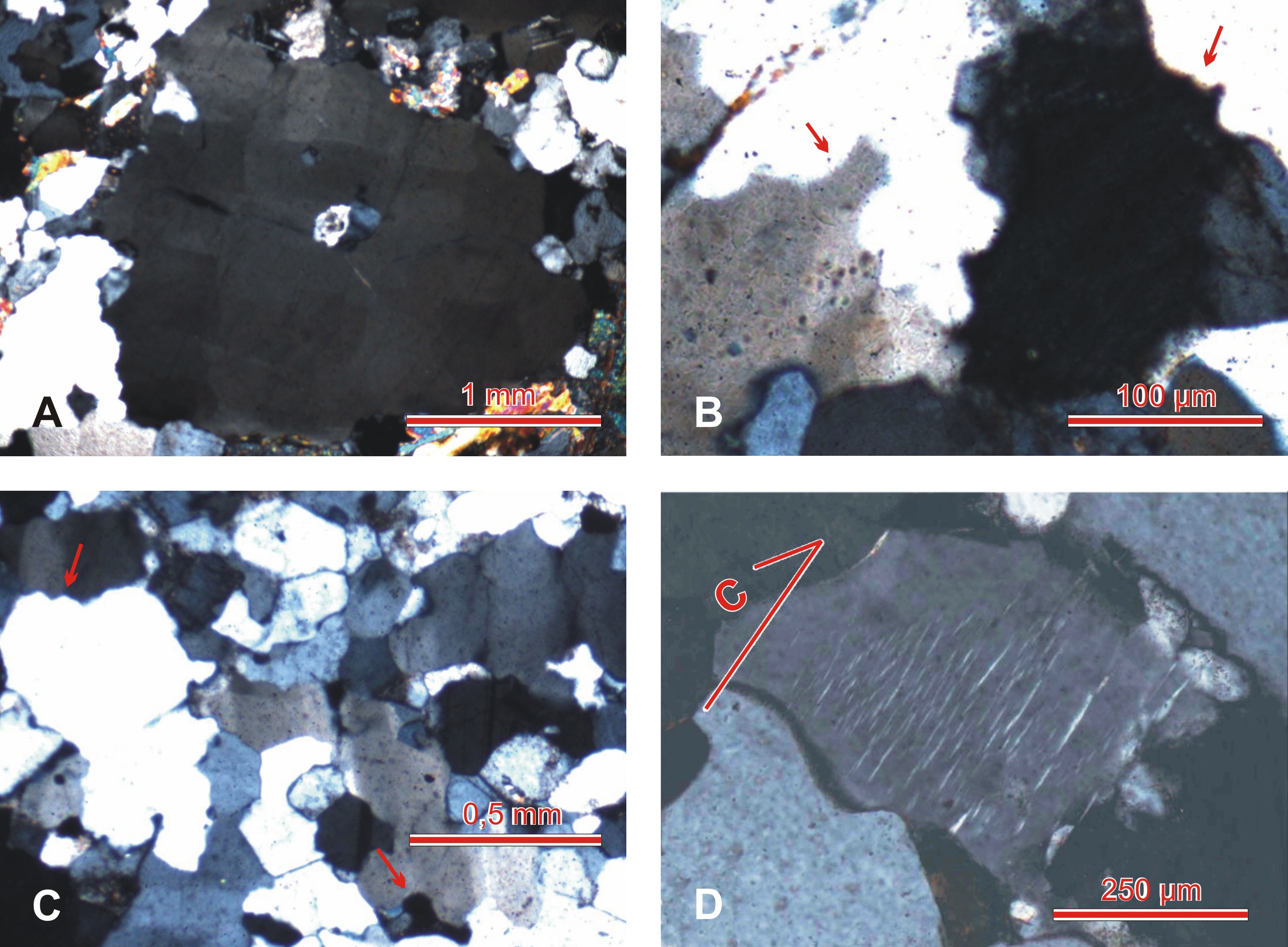 Se observan, además, maclas de deformación irregulares y con terminaciones en forma de cuña, producidas durante la deformación de baja temperatura, en cristales de plagioclasa con bordes irregulares generados por la deformación de alta temperatura (Fig. 13B), lo que, de igual modo, evidencia la sobreposición de la deformación de baja temperatura. Por otro lado, se encuentran cristales levemente fracturados, lo que indica que estuvieron sometidos a esfuerzos en condiciones de baja temperatura.