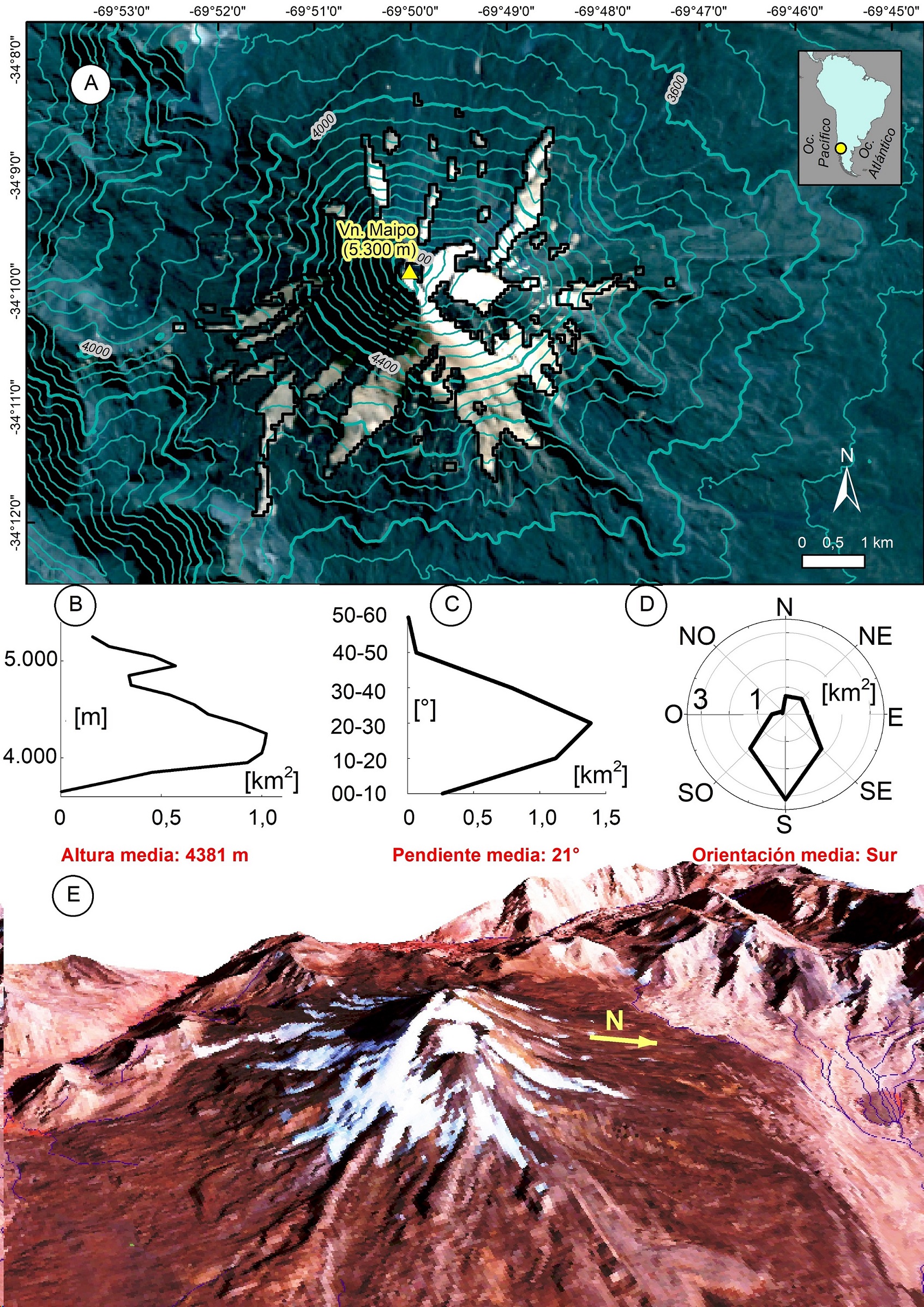 Por lo anteriormente expuesto, este estudio explora las posibilidades del análisis glaciológico en unidades distintas a la cuenca glaciar, criterio hidrológico basado en la divisoria de aguas. Por lo tanto, los efectos de la elevación, orientación y pendiente en la evolución de la cubierta glaciar son evaluados en este trabajo. Para ello se propone reconstruir el área ocupada por la cubierta glaciar del volcán Maipo durante el periodo 1976-2020 (34°09’50’’ S; 69°49’53’’ O); y compararla con el cambio de área en función de los factores morfométricos anteriormente mencionados. De esa comparación se espera dilucidar las diferencias en las interpretaciones realizadas según el criterio de análisis, y la necesidad de nuevos enfoques complementarios para el estudio de los cambios de área.