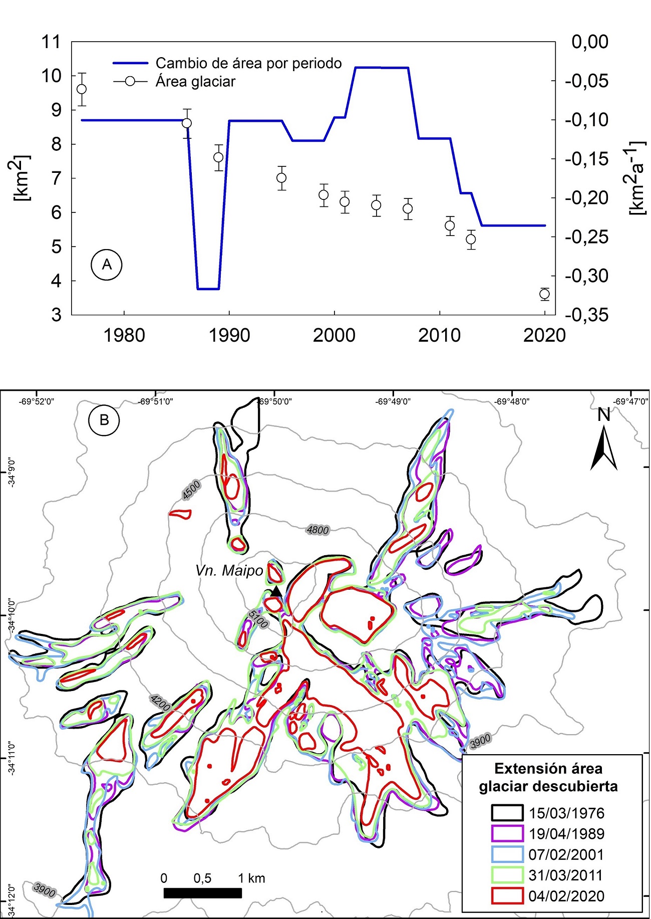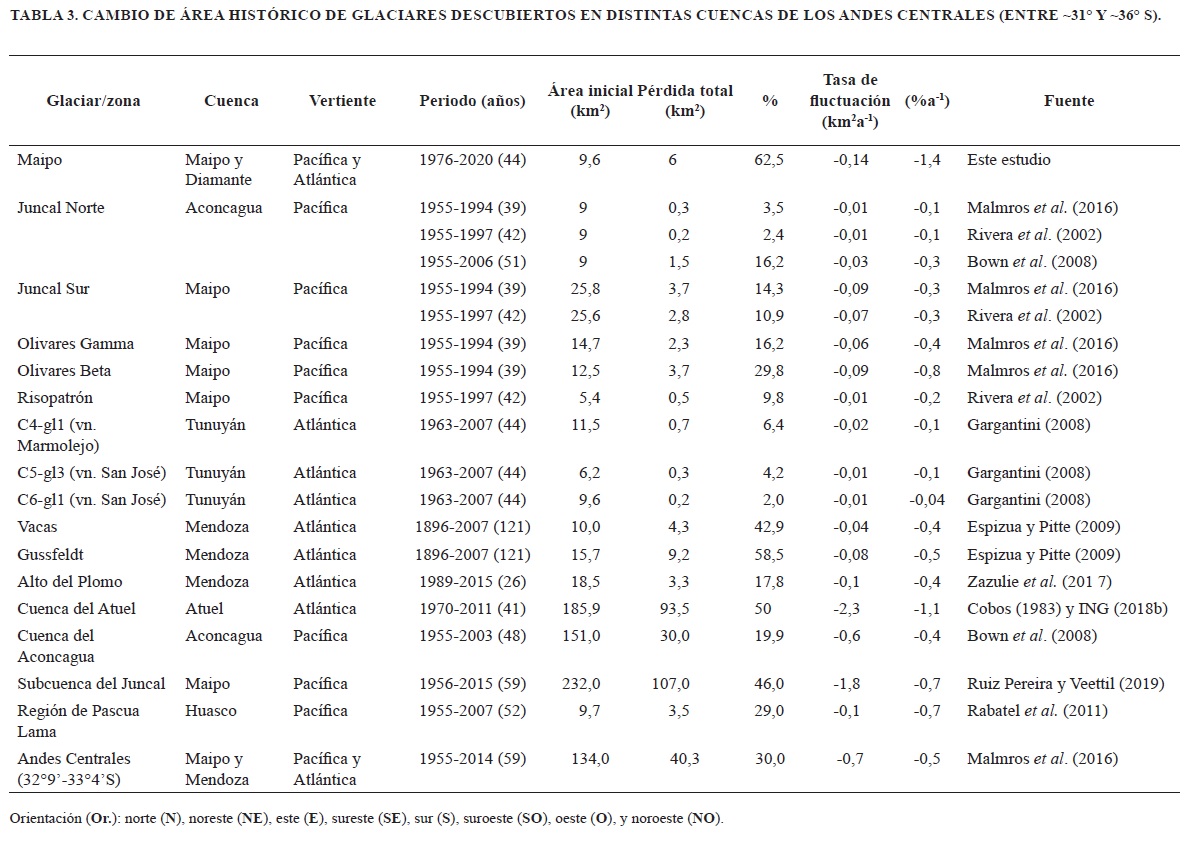 Entre los años 1976 y 2020 el glaciar del volcán Maipo perdió el 63% de la superficie inicial (9,6 km2) a un ritmo promedio de 0,14±0,01 km2a-1. Dicha reducción relativa es considerablemente superior a las encontradas en épocas similares en glaciares de los AC localizados más al norte como el Juncal norte y sur (16,2 y 14,3%, respectivamente), Olivares gamma y beta (16,2 y 29,8%, respectivamente) y Alto del Plomo (17,8%) (Bown et al., 2008; Malmros et al., 2016; Zazulie et al., 2017). Solo los glaciares Vacas (42,9%) y Gussfeldt (58,5%) experimentaron pérdidas similares (Espizua y Pitte, 2009).