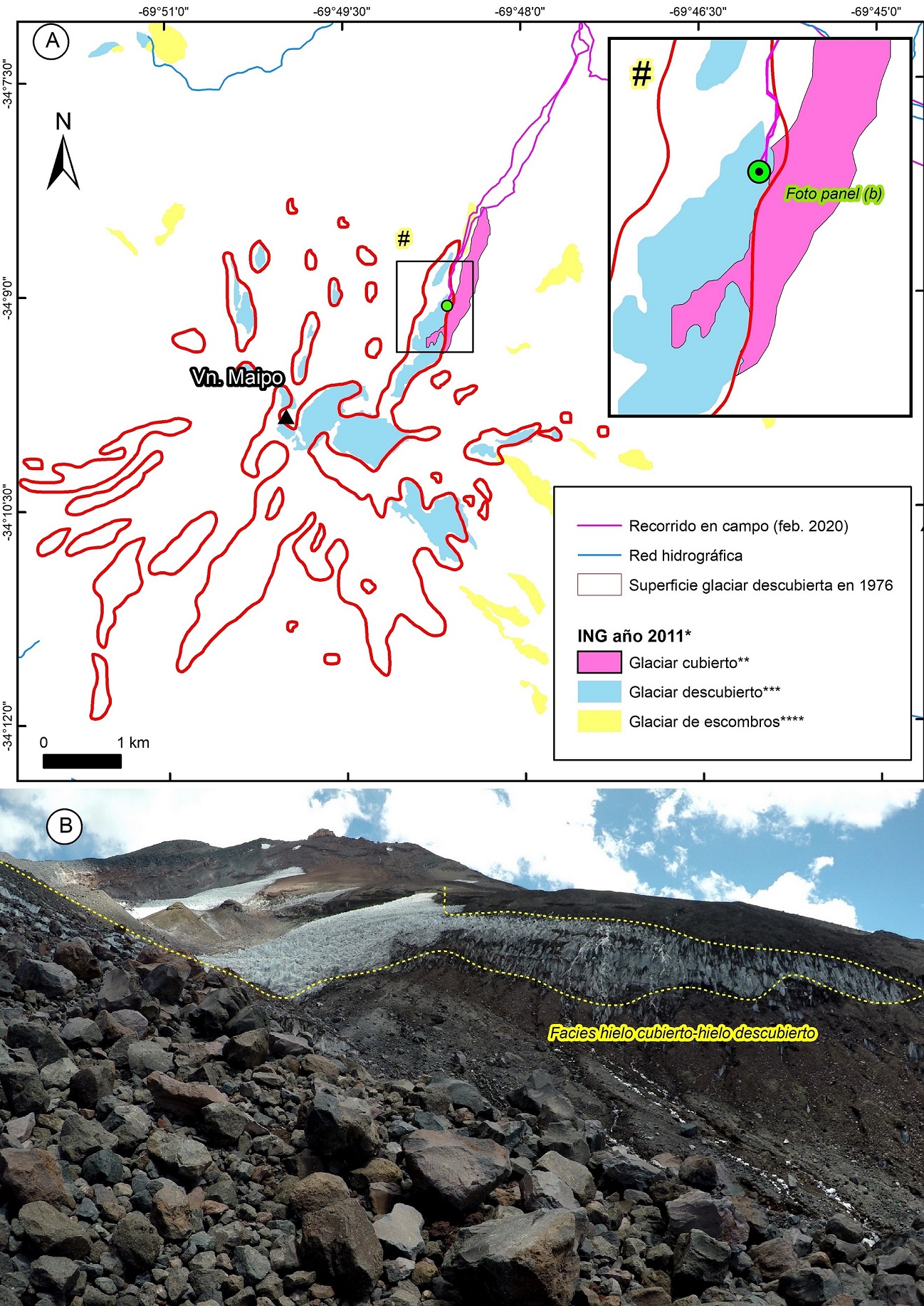 FIG. 7. A. Contraste entre el inventario de glaciares descubiertos, hecho a partir de la imagen satelital de 1976, y el Inventario Nacional de Glaciares (2018a), realizado a través de una imagen satelital del año 2011. B. Proceso de sepultamiento del glaciar descubierto, observado en febrero 2020 (Foto A. Lo Vecchio).