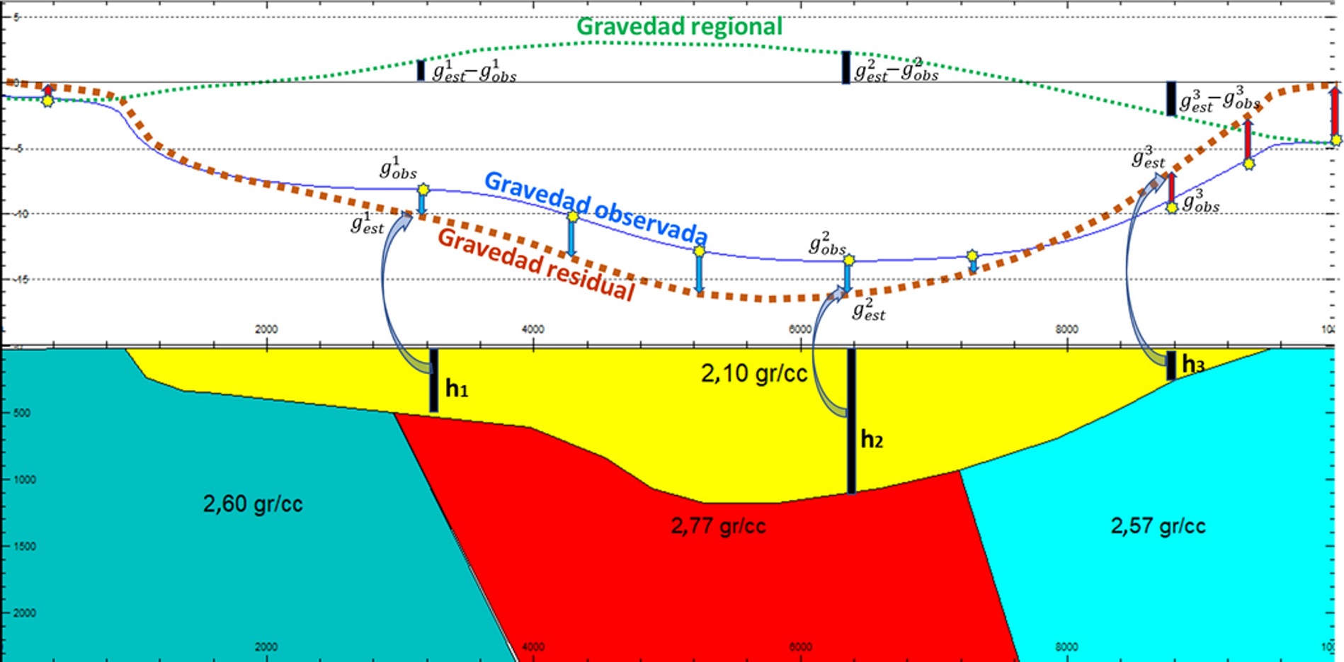 El campo gravimétrico residual es el que nos permite estimar la profundidad hasta el basamento, pero para su correcta apreciación es necesario determinar el campo gravimétrico regional. Diversas estrategias se pueden aplicar para establecer este campo regional, por ejemplo, contar con información de sondajes y/o filtro de bajas frecuencias (utilizar un filtro pasa-bajo que elimine las longitudes de onda de decenas de kilómetros, asumiendo que están asociadas a fuentes gravimétricas profundas, e.g., Yáñez et al., 2015). En la figura 4 se plantea la opción de disponer puntos de control de la profundidad hasta el basamento en puntos h1, h2, y h3 (ya sea mediante sondajes, información geológica o métodos geofísicos que detecten el basamento resistivo o sísmico). Si se conoce la profundidad al basamento en puntos de control, se puede estimar la señal gravimétrica asociada al relleno sedimentario según un modelo de capa plana (e.g., Telford et al., 1990) (g1est, g2est, g3est, en Fig. 4). Entonces, la diferencia entre la gravedad observada y la estimada en estos puntos de control permite determinar el campo regional asociado (g1est- g1obs, g2est, g2obs, g3est, g3obs, en Fig. 4). Una vez conocido el campo gravitatorio regional en algunos puntos de control es posible evaluar su variación lateral mediante la determinación de un polinomio de cierto grado de curvatura (e.g., ajuste matemático de una función de segundo o tercer grado).