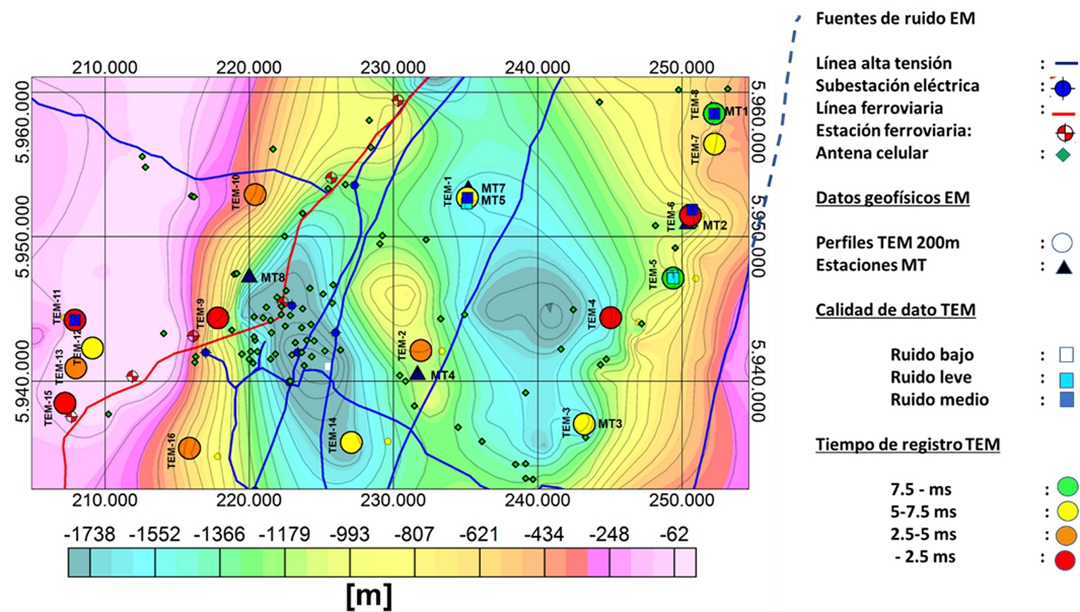 En el área de estudio se realizaron mediciones de TEM y MT con el fin de caracterizar el subsuelo a diferentes profundidades y, al mismo tiempo, tener un control cruzado entre las distintas metodologías utilizadas.