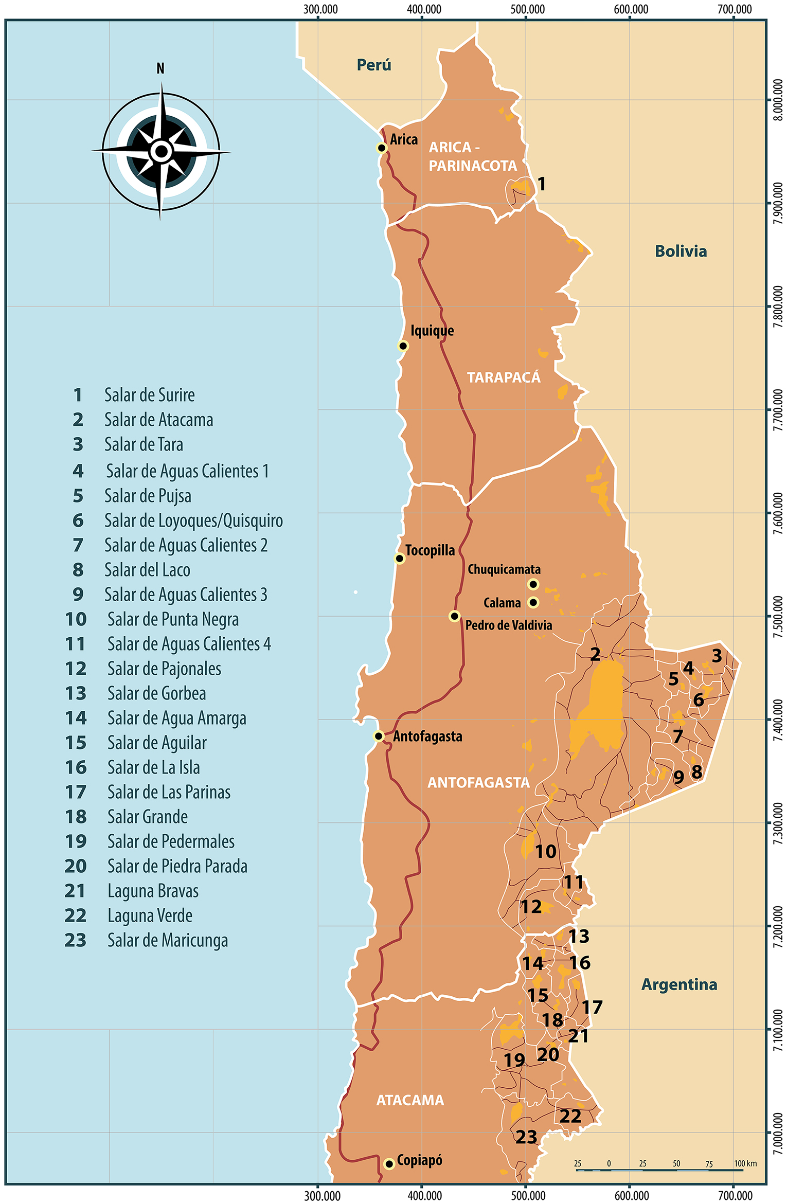 El norte de Chile se caracteriza por una sucesión de cordilleras de orientación norte-sur que limitan cuencas ocupadas por numerosos lagos salinos y costras de sal, llamados colectivamente salares (Chong, 1984; Vila, 1990; Risacher et al., 2003). Tanto los salares andinos como preandinos del norte de Chile constituyen uno de los complejos evaporíticos más importantes del mundo y, entre otros, contienen recursos significativos de litio (Ericksen y Salas, 1989; Cabello, 2021). Al menos 59 salares (ca. 5.211 km2), lagos salinos y lagunas (unos 222 km2) se encuentran emplazados en cuencas endorreicas, distribuidas dentro de un área de 53.000 km2. Estas definen una franja de orientación norte-sur, entre los 18 y 27° S, con una longitud de unos 1.000 km y un ancho promedio de 120 km (50-250 km) en la vertiente occidental de la cordillera de los Andes (Fig. 1).