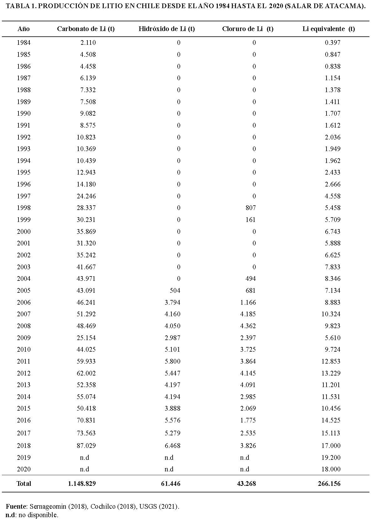 Chile es el principal productor de litio a partir de depósitos de salmuera. En 2020, produjo 18.000 toneladas (USGS, 2021), las que representan alrededor del 22% del total de la producción mundial de 82.000 toneladas de litio (t Li), y lo ubica como el segundo productor en el mundo después de Australia. La producción acumulada total de Chile en los últimos 36 años es de 266.156 t Li (Tabla 1).