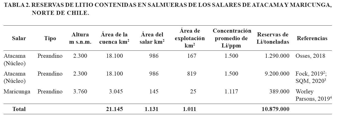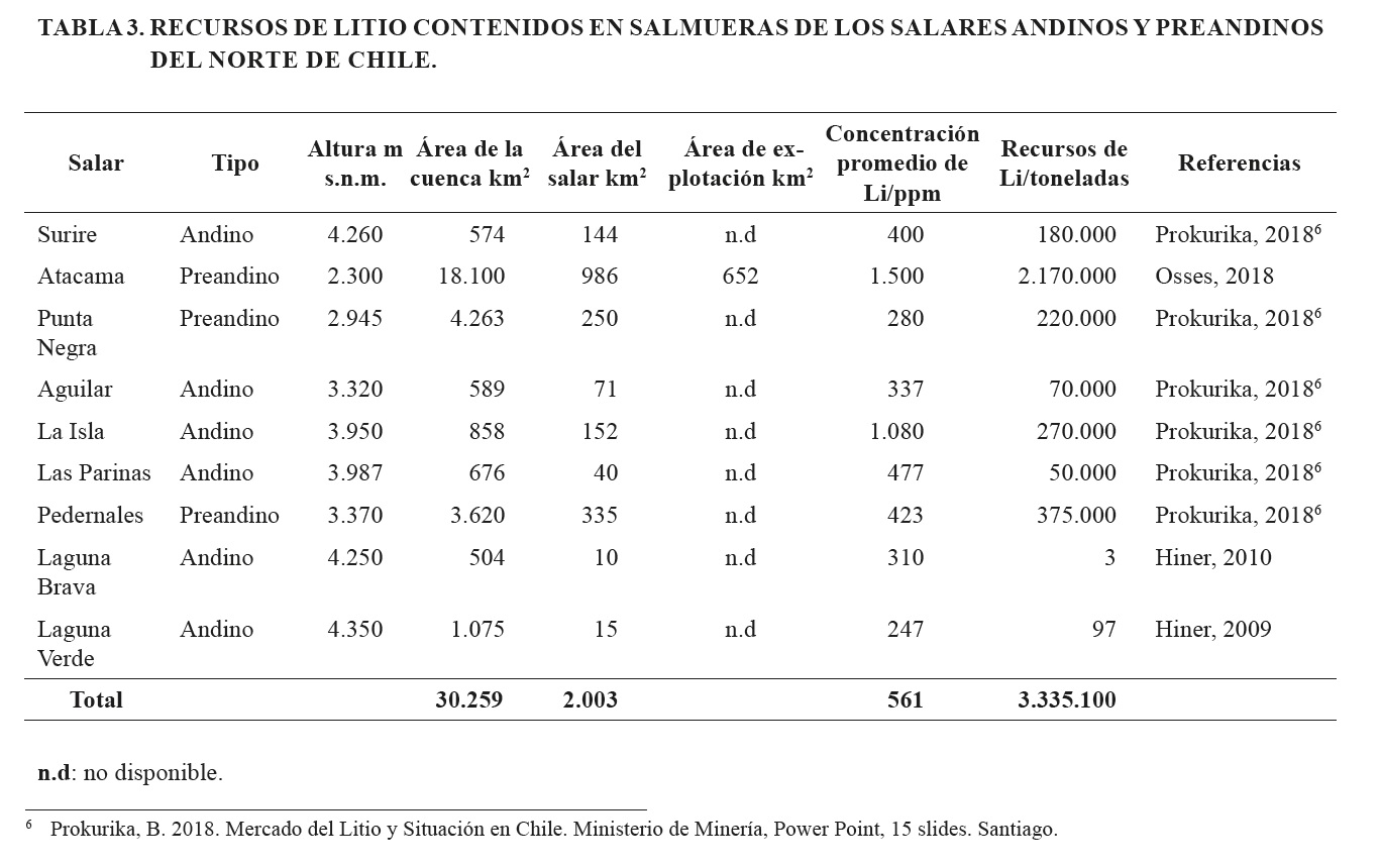 Un grupo de 9 salares corresponde a aquellos que incluyen cálculos individuales de tonelaje con concentraciones medias de litio notificadas (Tabla 3, incluye parte del salar de Atacama). Este grupo cubre una superficie de 2.003 km2, con una cantidad estimada de 3.335.100 toneladas de litio con una concentración media en las salmueras de 561 ppm. Las cifras de tonelaje de litio (Tabla 3) no cumplen con el código NI 43-101, pero podrían utilizarse como una indicación preliminar del potencial económico, así como una referencia para futuras actividades de exploración y evaluación.