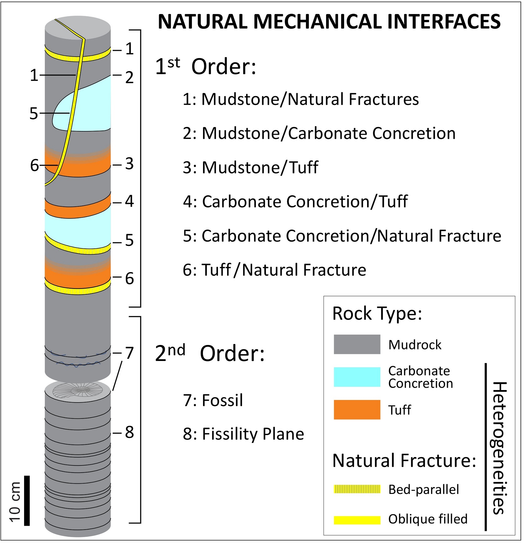 The stratigraphy of the Vaca Muerta Formation is mainly conformed by mudstones (>85%). The remaining rocks, such as carbonate concretions and tuffs, characterized by a strong rheological contrast with the surrounding mudrock are considered as first order heterogeneities (1 to 6 in Fig. 1). Second order mechanical interfaces correspond to the interface itself that generates a local mechanical contrast within a rock presenting the same mechanical properties such as compacted fossils (or their imprint) and fissility planes (7 and 8, respectively in Fig.1). Both heterogeneities and interfaces manifest along a wide range of scales, from outcrop observations, cores, laboratory tests, as far as to the scale of nanometers (Ilgen et al., 2017). These natural interfaces may evolve as an effective discontinuity that splits the rock, or a potential discontinuity within a rock that has not been entirely broken yet. Artificial discontinuities, such as cuts and induced fractures developed during core extraction and preservation are removed from this analysis.