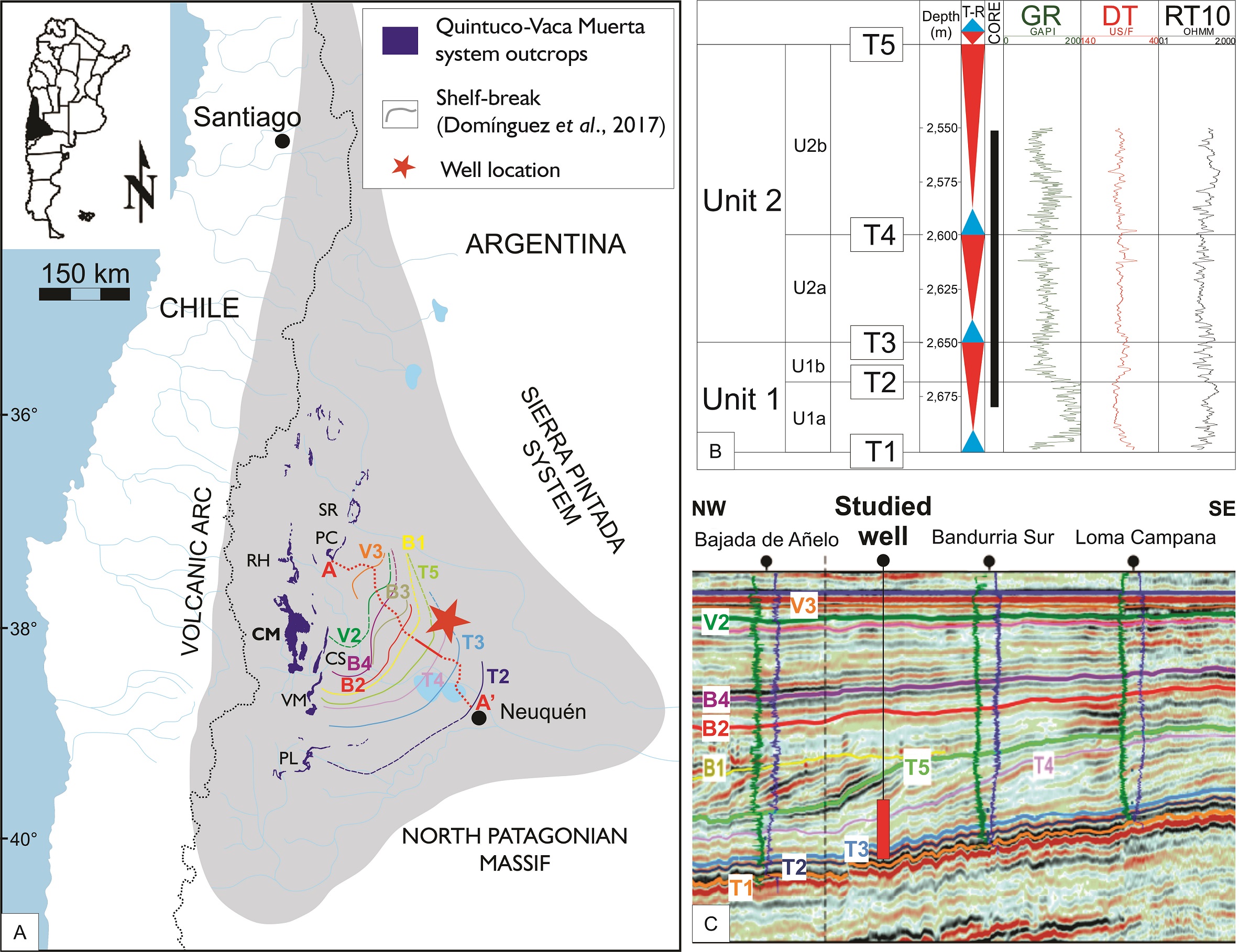 FIG. 2. A. Location of the Neuquén Basin (Argentina), well A (red star) and Vaca Muerta Formation outcrops (SR: Sierra de Reyes; PC: Puerta Curaco; RH: Rahueco; CM: Cerro Mulichinco; CS: Cordón del Salado; VM: Sierra de la Vaca Muerta; PL: Picún Leufú). Colored lines represent the shelf-breaks of the Vaca Muerta-Quintuco system. Modified from Domínguez et al. (2017), using the main seismic horizon nomenclature according to Desjardins et al. (2016). A-A’: northwest seismic section analyzed by Domínguez et al., 2016. B. Subdivision of Vaca Muerta Formation: T1 to T5 are seismostratigraphic l horizons regionally defined (Desjardins et al., 2016) correlated to well A, subdividing the shale play into 2 principal units (Unit 1: Lower Vaca Muerta; Unit 2: Upper Vaca Muerta) and 4 subunits (U1a, U1b, U2a and U2b) based on well logs response. Blue and red triangles represent the transgressive-regressive cycles. Black vertical bar: cored interval. GR: gamma ray log; DT: sonic log; RT10: resistivity log. C. Seismic section A-A’ displaying the location of the surfaces defined by Desjardins et al. (2016) and the extension of the studied core (in red). Modified from Sattler et al. (2016).