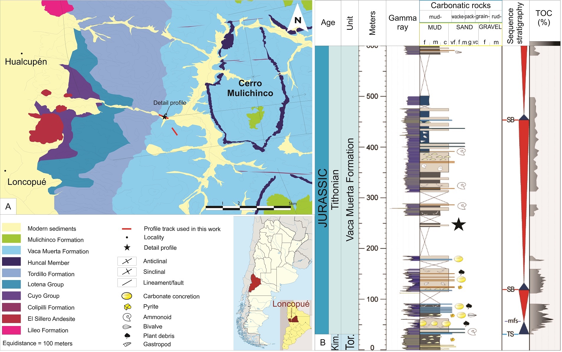 FIG. 4. Cerro Mulichinco outcrop. A. Location map of the studied outcrop. Red lines indicate the stratigraphic profiles used in the present study, black star indicates location of detailed profile presented in figure 7 (Arroyo Mulichinco). B. General simplified stratigraphic and lithologic log of Cerro Mulichinco outcrop with the transgressive-regressive (T-R) cycles (blue and red triangles) and TOC content, indicating the stratigraphic location of the detailed profile at “Arroyo Mulichinco” (black star) modified from Otharán (2020). Rock classification: Carbonate (Dunham, 1962), Siliciclastic (Pettitjohn, 1975).