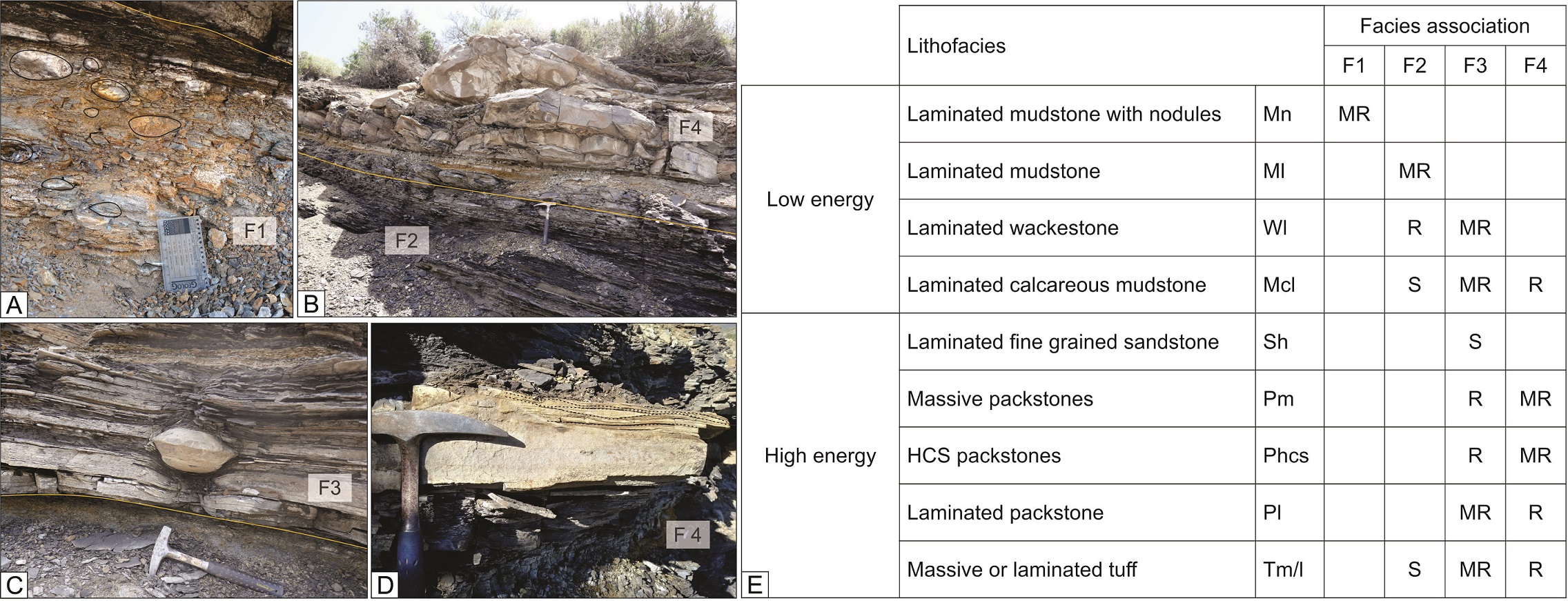 Facies association F4: massive packstones (Pm), hummocky cross-stratification (Phcs, Fig. 6D) and laminated calcareous mudstones (Mrl). This facies association includes the thickest volcanic levels of approximately 15 cm. The beds are tabular, approximately 20 cm thick, with sharp planar bases and tops. The carbonate concretions levels of larger diameter are associated with the packstones lithofacies, displaying up to 50 cm thick beds (Fig. 6B).