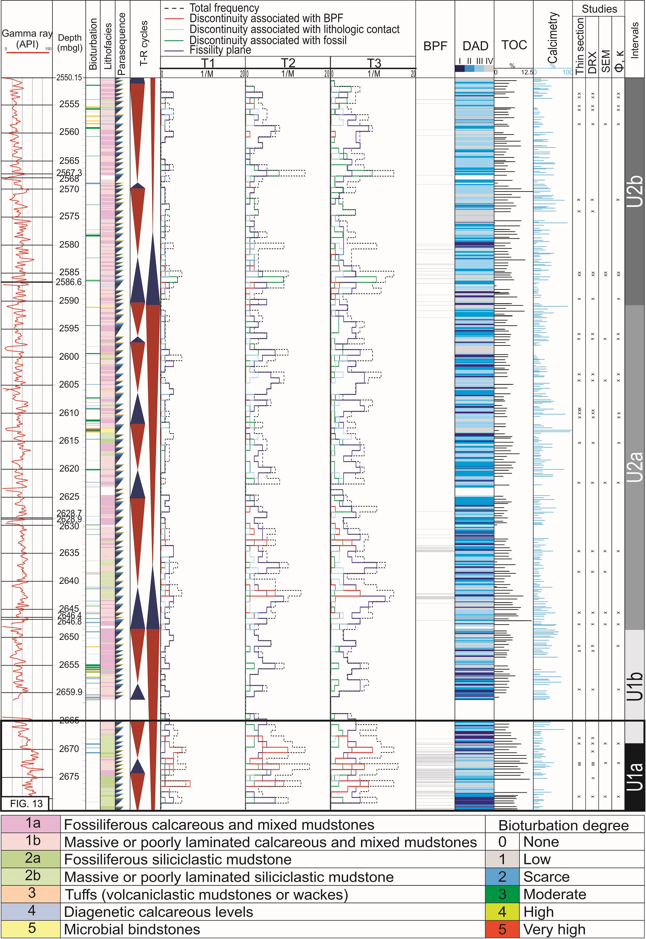 FIG. 10. Relationship between DAD index and well A core information. Transgressive-Regressive (T-R) cycles represented in blue and red triangles, respectively. Discontinuity plane density at three different times: T1: 7 weeks after core extraction (entire core); T2: 14 months after core extraction (slabbed); T3: 5 years since core extraction (slabbed). First order discontinuities: interfaces at lithologic contacts (principally mudstones-tuffs and minor quantities of mudstones-carbonate concretion) and interfaces between bed-parallel fractures (BPF) and their surrounding rocks. Second order discontinuities are associated with fossil imprints and fissility planes. Depth in meters below ground level (mbgl). Lower rectangle indicates the interval included in figure 13. The sequencial interpretation and the bioturbation index are based on Otharán (2020) and Otharán et al. (2022).