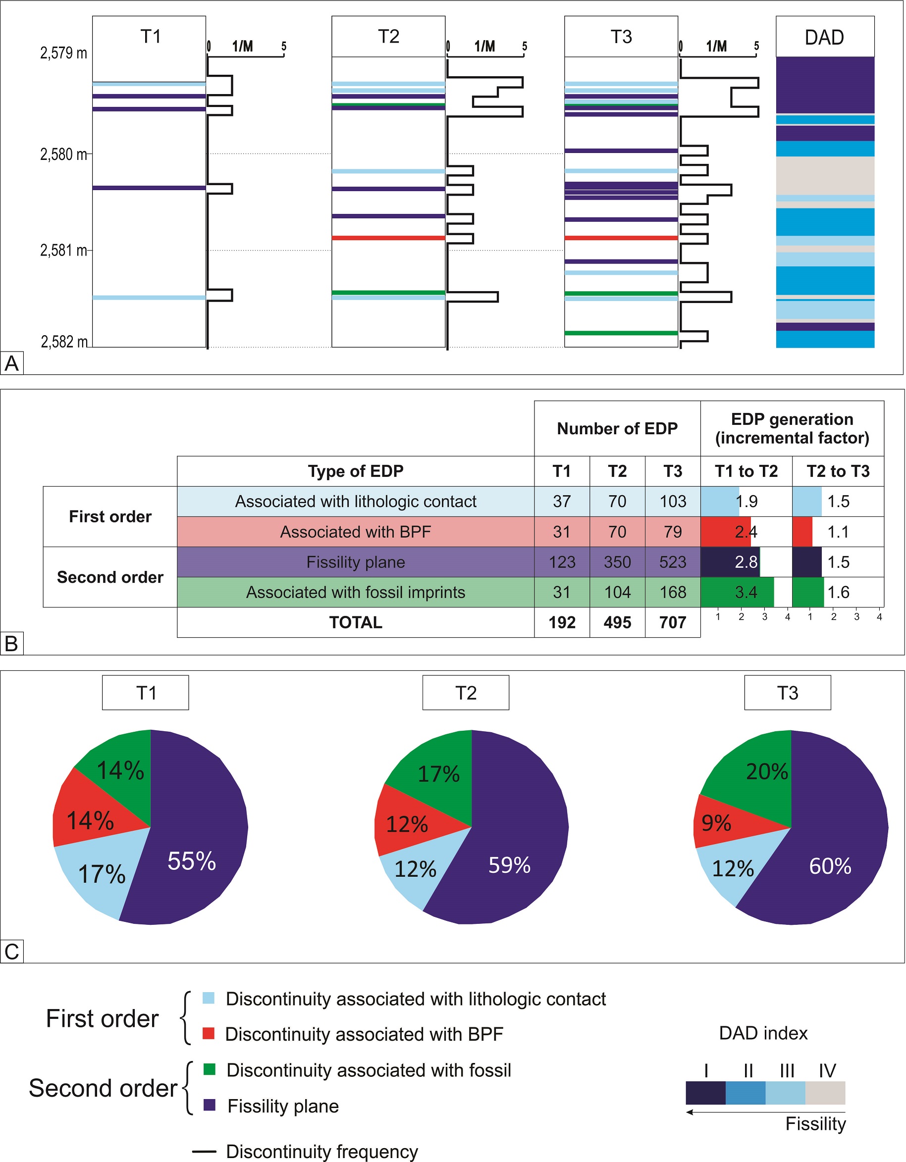 The analysis of the density of EDP through time shows that they develop preferentially in high fissility intervals (DAD I or II, Figs. 10 and 11A, T1 to T3). The evolution through time of the different discontinuity types (Fig. 11B) reveals that the greatest increment occurs from T1 to T2, where all types of discontinuities in T2 almost double and triple the amount of EDP in T1 (increment factor of 1.9 to 3.8, Fig. 11B). In general, the rate of generation of EDP at this time is greater for second order discontinuities (fissility planes and discontinuities associated with fossils) than for first order discontinuities (associated with lithologic contacts and BPF). From T2 to T3 the EDP displays a growth of approximately 50% (incremental factor about 1.5), except for the EDP associated to BPF, with a quantity only about 7% in T3 more than the previous T2. Finally, the ratio of first order to second order EDP diminishes through time (Fig. 11C). In the studied core interval, a strong correlation between the evolution of the natural discontinuity density and the DAD fissility index is observed. The comparison between the 3 frequency curves (Fig. 10) shows that rocks which tend to break with high density correspond mainly to the high fissility classes (DAD I and II), whereas core intervals that remained mostly unbroken correlate with none or low fissility classes (DAD III and IV).