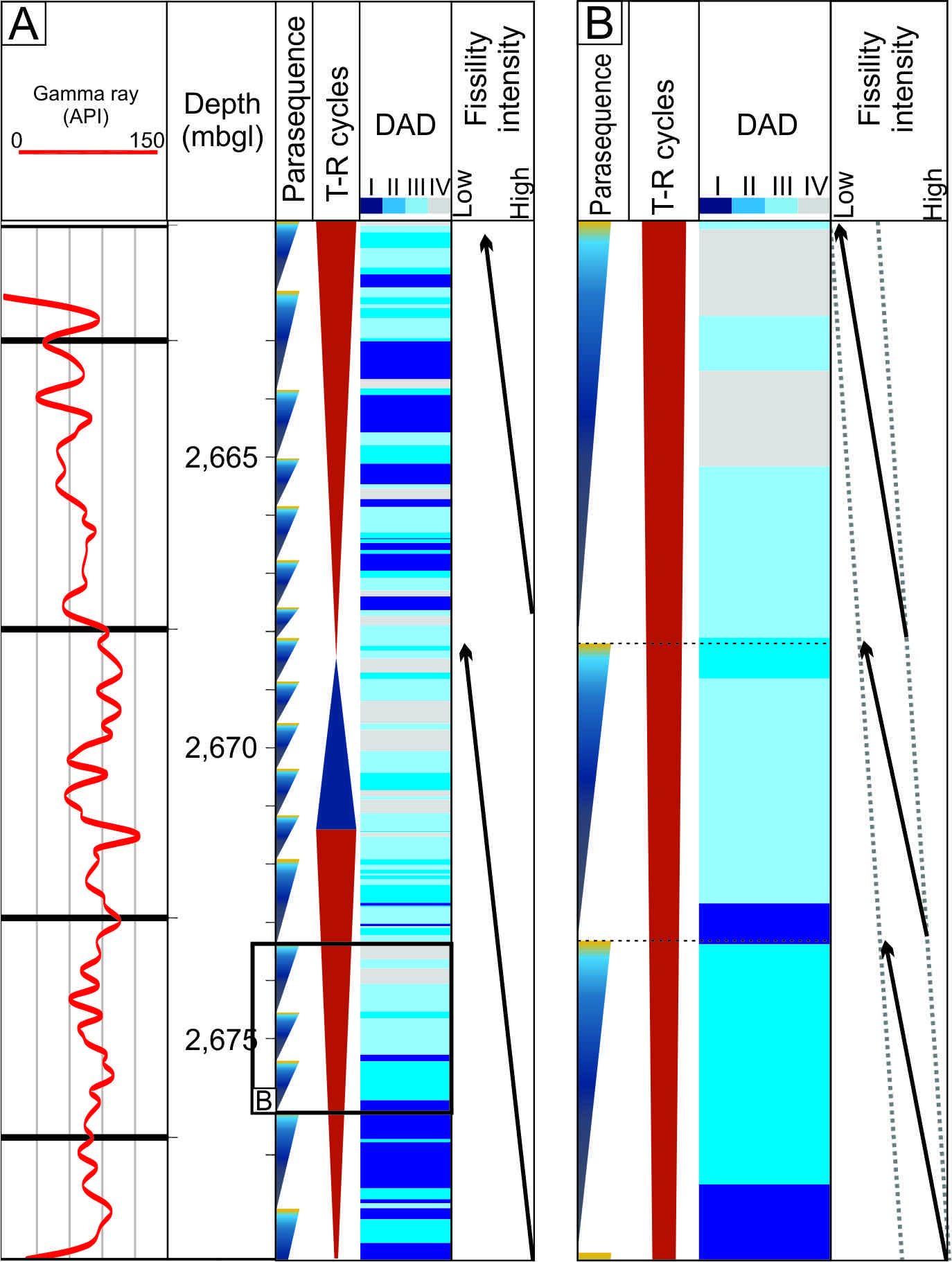 FIG 13. Relationship between fissility intensity (DAD index) and sequence stratigraphy. A. At Transgressive-Regressive (T-R) cycle scales. B. At parasequence scale. High fissility intensities (DAD=I or II) develop towards the first stages of the regressive system tracts and the bottom of the parasequences, which become less fissile (i.e., more massive, DAD=III or IV) towards the top. Note that fissility intensity diminish between each parasequence towards the top. The sequential interpretation is based on Otharán (2020) and Otharán et al. (2022).