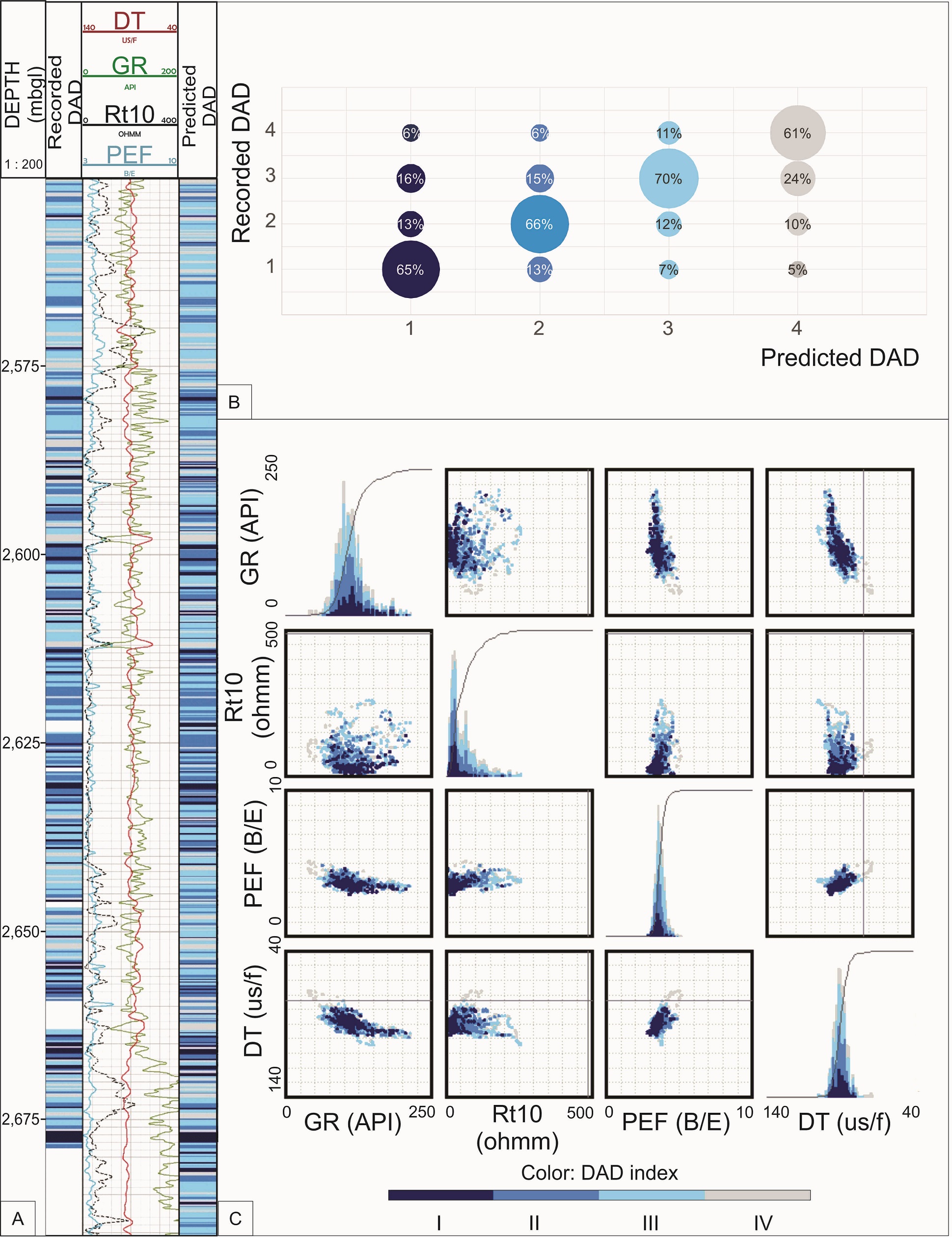 The synthetic DAD index obtained from the supervised classification of the electric well logs reproduces the logged DAD index with a confidence between 60 and 70 % (Fig. 19A, B). DAD classes I and II intervals, representing high fissility rocks display high gamma ray values, narrow range of transit times and low values of photoelectric absorption factor and resistivity. In contrast, DAD classes III and IV intervals with poor or no fissility show low gamma ray responses, wide range of transition times and high values of photoelectric absorption factor and resistivity. Analysis of the crossplots in figure 19C shows that the resistivity log is the most important parameter to discriminate between all the DAD classes as it exhibits the widest dispersion. The shallow resistivity log is used in this model as a proxy for rock fabric, since it measures small variations at the first few millimeters of the borehole wall, similar to image logs (Linek et al., 2007). This parameter is key for discrimination between DAD classes, highlightting the relevance of the textural control on fissility.