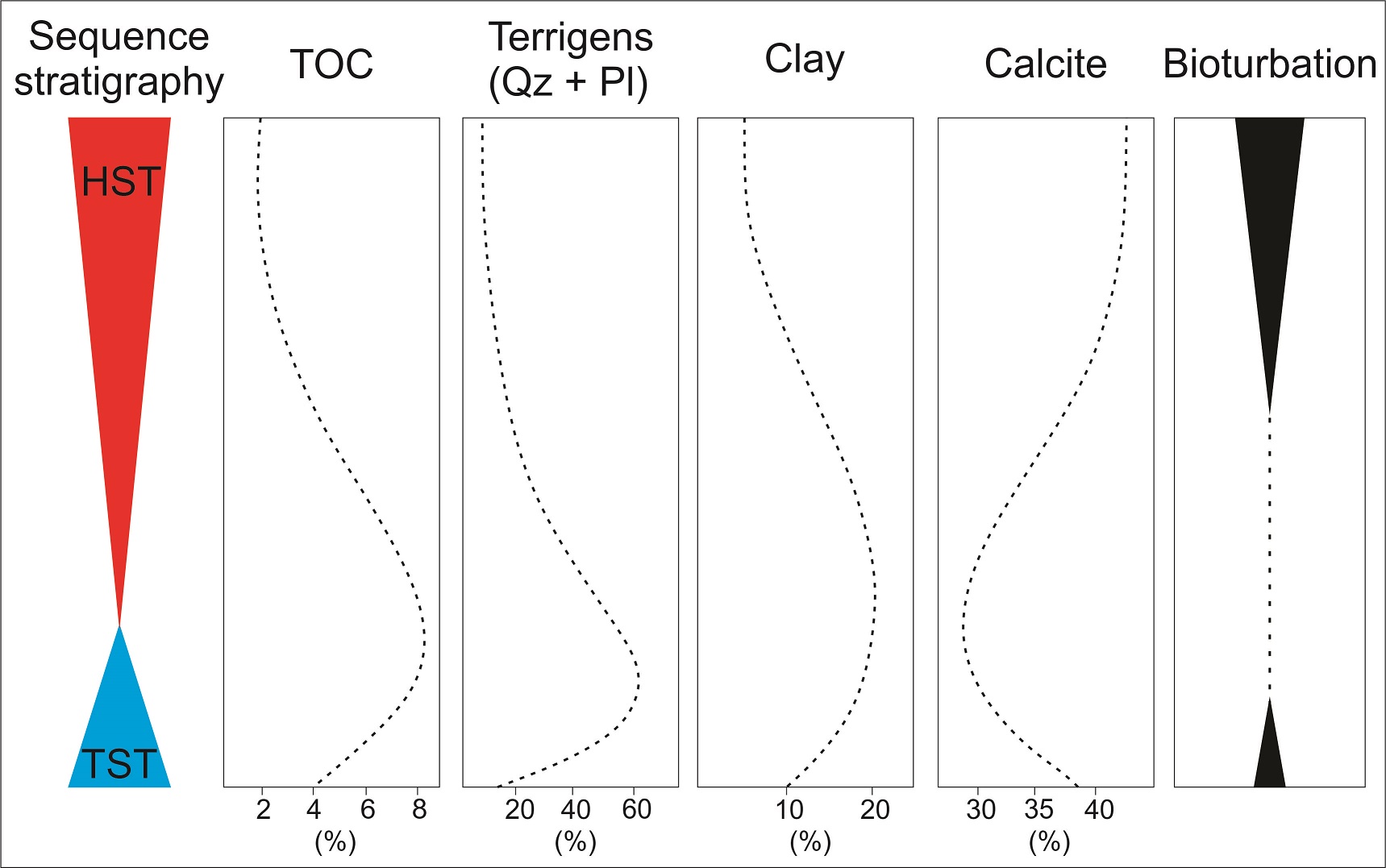 Figure 6E synthetizes the different lithofacies present in this section, discriminated between low and high-energy facies. The low energy lithofacies represent sedimentation in fair-weather conditions, dominated by settling of fine-grained suspended material. On the contrary, high-energy lithofacies suggest a deposition dominated by tractive flows, associated with storm events that result in hummocky cross-stratification. Vertical arrangement of these facies allows the recognition of small fluctuations in water depth and environmental energy. These small variations can be assimilated to high frequency transgressive-regressive cycles (Fig. 7) in an outer to mid ramp environment (Kietzmann et al., 2016).