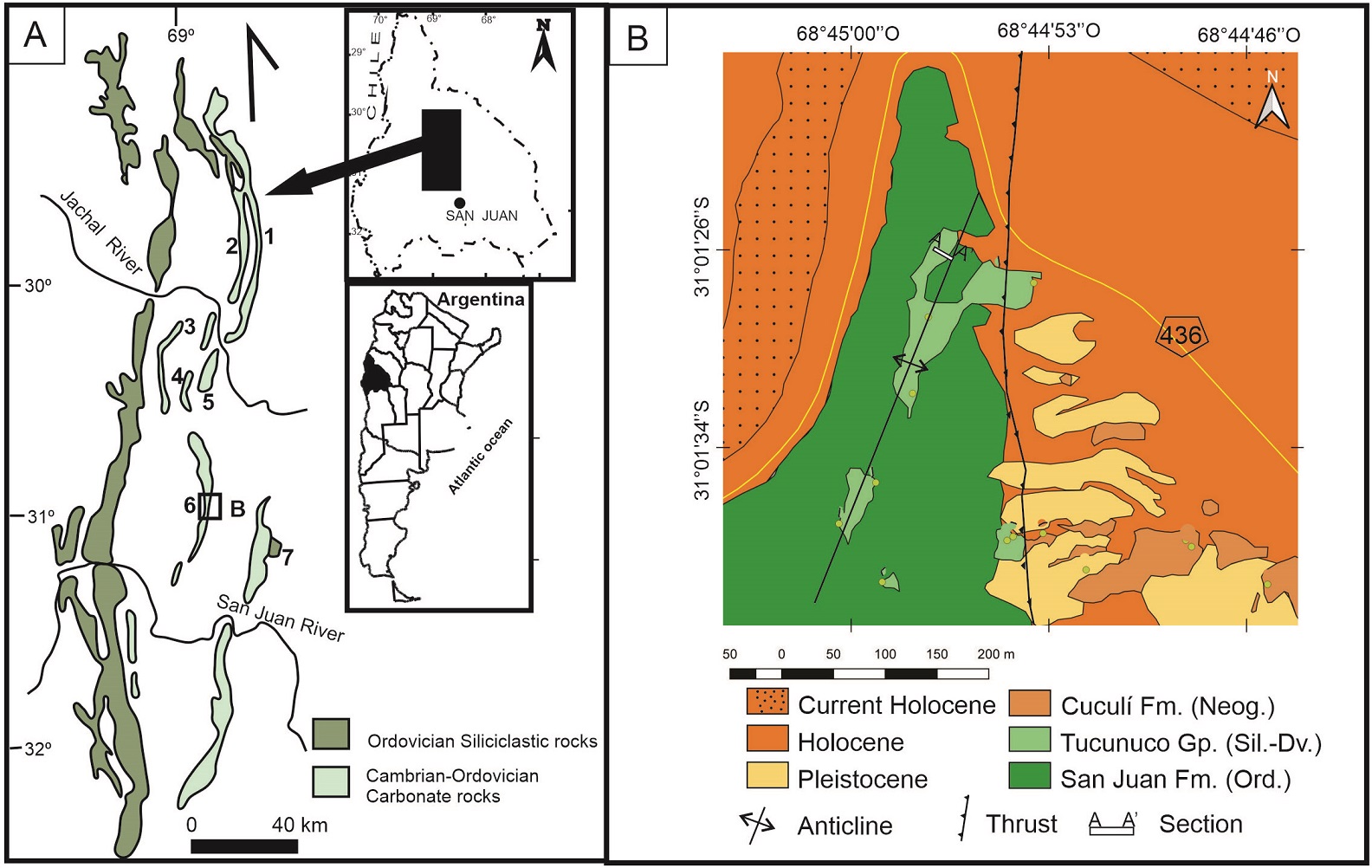 The study area (Fig. 1) is located in the Central Precordillera, which is considered as typical thin-skinned fold and thrust belt with a vergence to the east. All previous studied sections in the Central Precordillera (Mestre, 2012; Mestre and Heredia, 2013a, b; Heredia, 2012), where the top of the San Juan Formation outcrops, are located on the western margin of each thrust fault, by the contrary, there is no data of this formation from the eastern margin. The exploration of new areas and sections from the Central Precordillera is an imperative assignment for increasing the knowledge on the Darriwilian basin paleogeography, as well as the microfossil diversity and distribution.