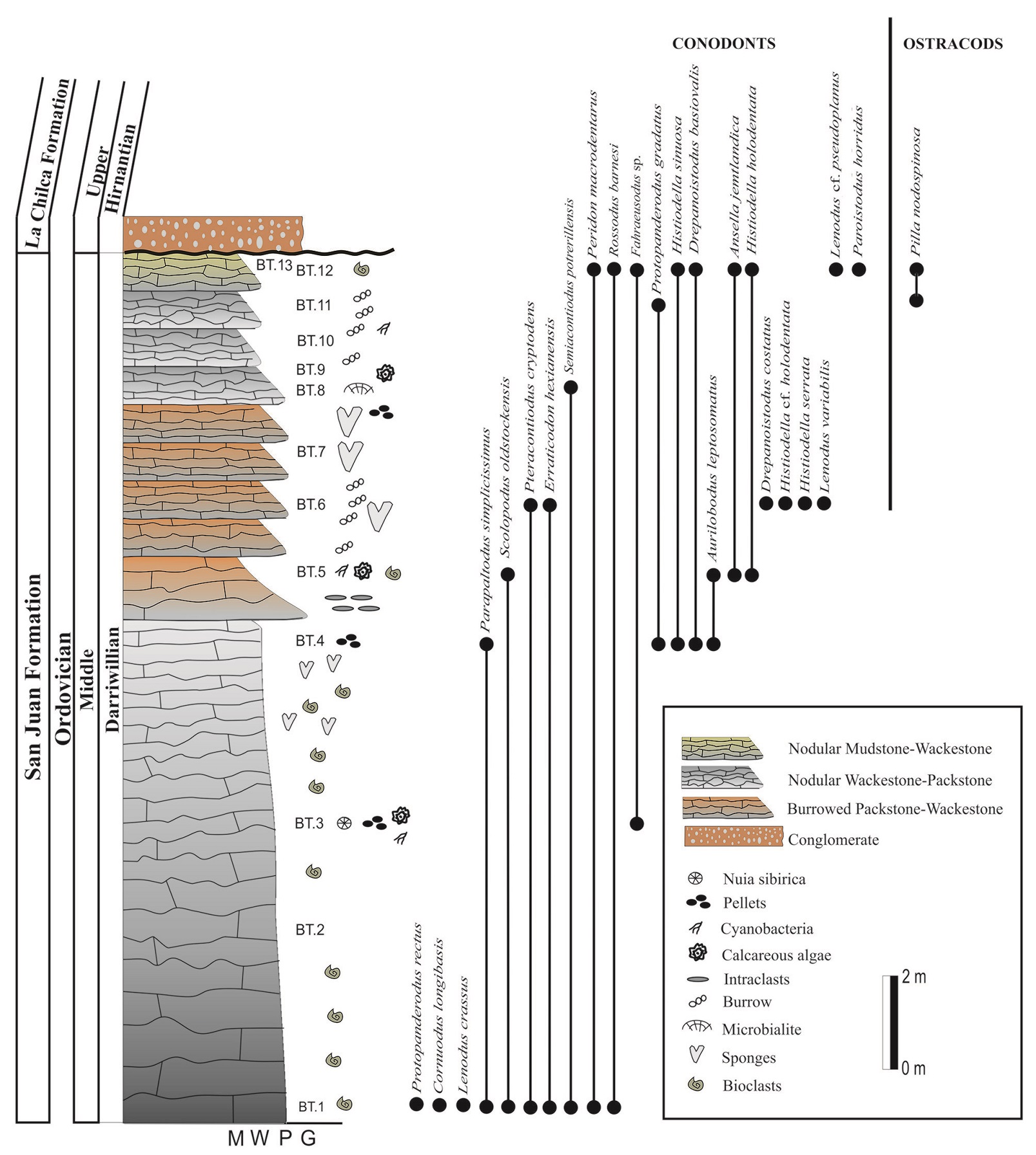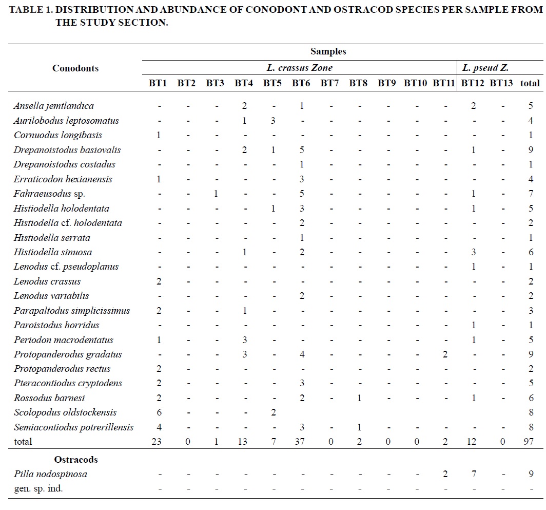 The L. crassus Zoneassociated conodont fauna in the study section includes: Ansella jemtlandica (Löfgren), Aurilobodus leptosomatus, Cornuodus longibasis (Lindström), Drepanoistodus basiovalis (Sergeeva), Drepanodus arcuatus Pander, Erraticodon hexianensis, Fahraeusodus sp., Histiodella sinuosa, H. serrata, H. holodentata, H. cf. holodentata, L. crassus, L. variabilis, Parapaltodus simplicissimus Stouge, Periodon macrodentatus (Graves and Ellison), Protopanderodus gradatus Serpagli, P. rectus (Lindström), Rossodus barnesi Albanesi, Scolopodus oldstockensis Stouge and Semiacontiodus potrerillensis Albanesi (Fig. 2).