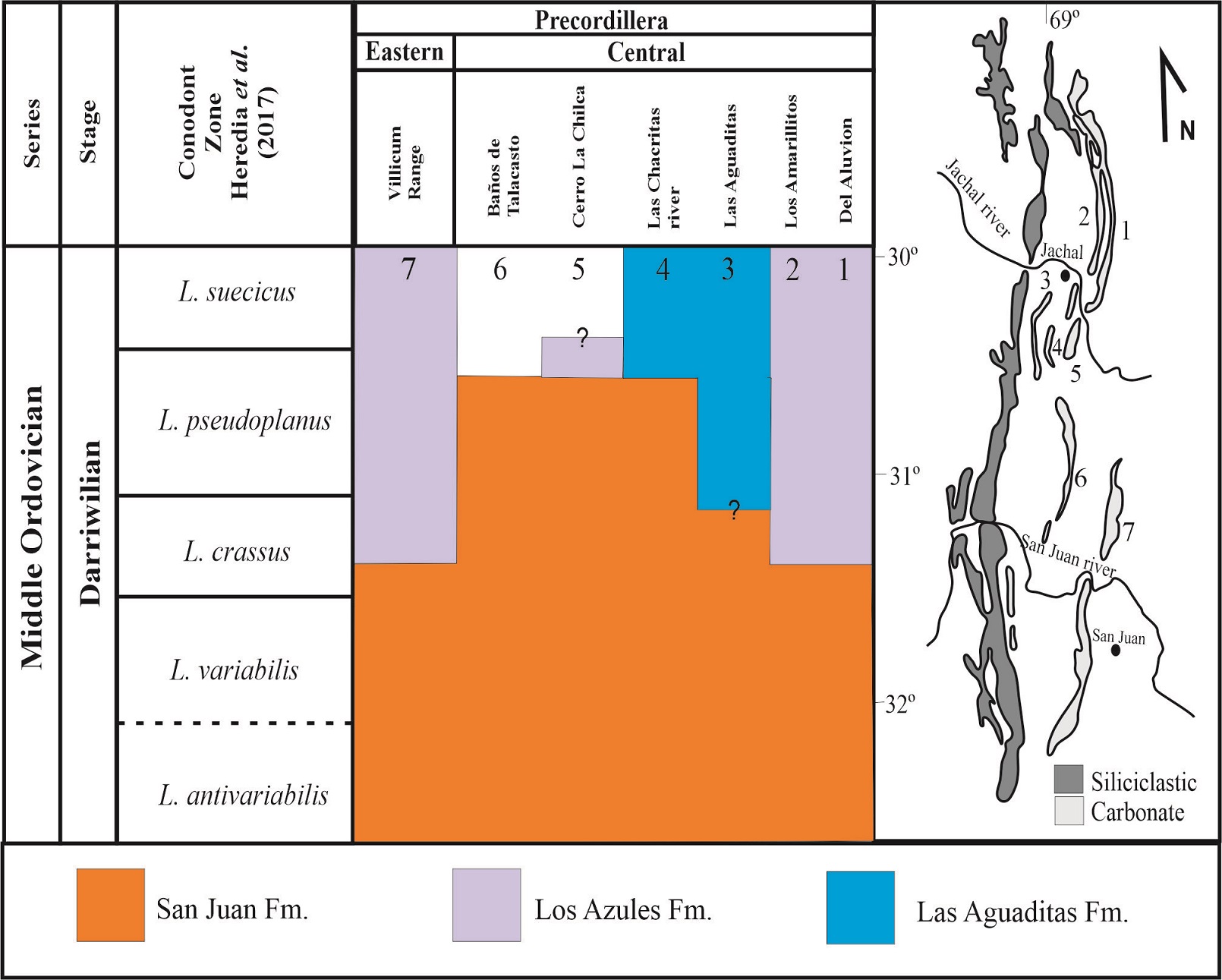 The conodont biostratigraphy studies from the top of the San Juan Formation in the Talacasto range are limited. Lozano and Hünicken (1990) recognized the P. serra Zone for the uppermost beds of the San Juan Formation, but these authors did not offer details of the section sampled. Then, those conodont association was reinterpreting by Lehnert (1995), who proposed the E. suecicus Zone for these levels based on the presence of the conodont Histiodella kristinae Stouge. On the other hand, the L. variabilis Zone was mentioned for the top of San Juan Formation in the Ancha creek (Albanesi et al., 2006).