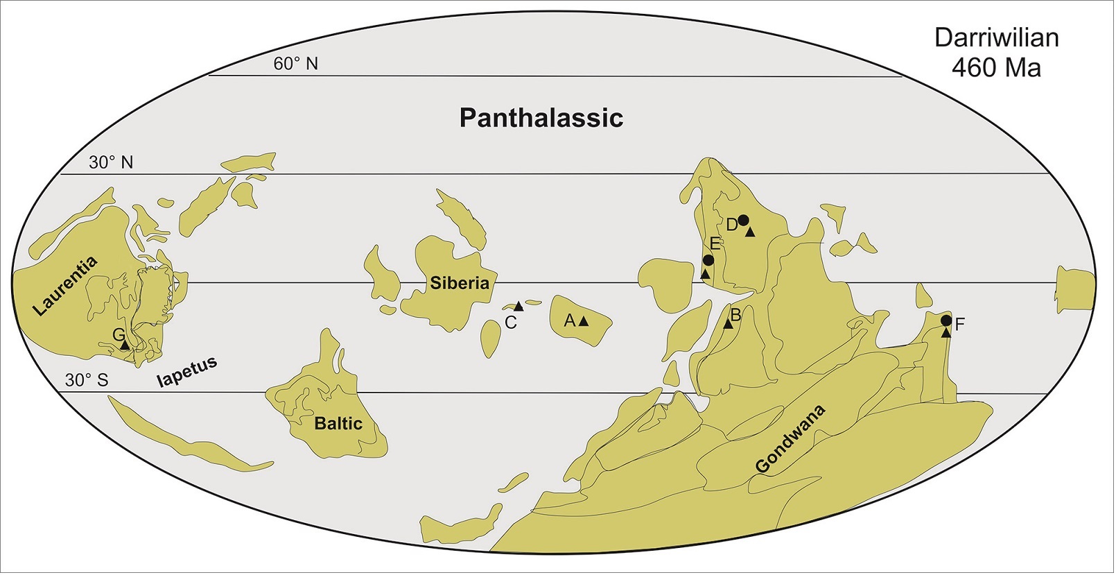 FIG. 9. Paleogeographical reconstruction for the Middle Ordovician (Torsvik and Cocks, 2013) showing geographical distribution of the Aurilobodus leptosomatus (triangle) and ostracod genus Pilla (circle). (A) North China, (B) South Tibet, (C) Central Asia, (D) Australia, (E) Thailand, (F) Precordillera and (G) Newfoundland.