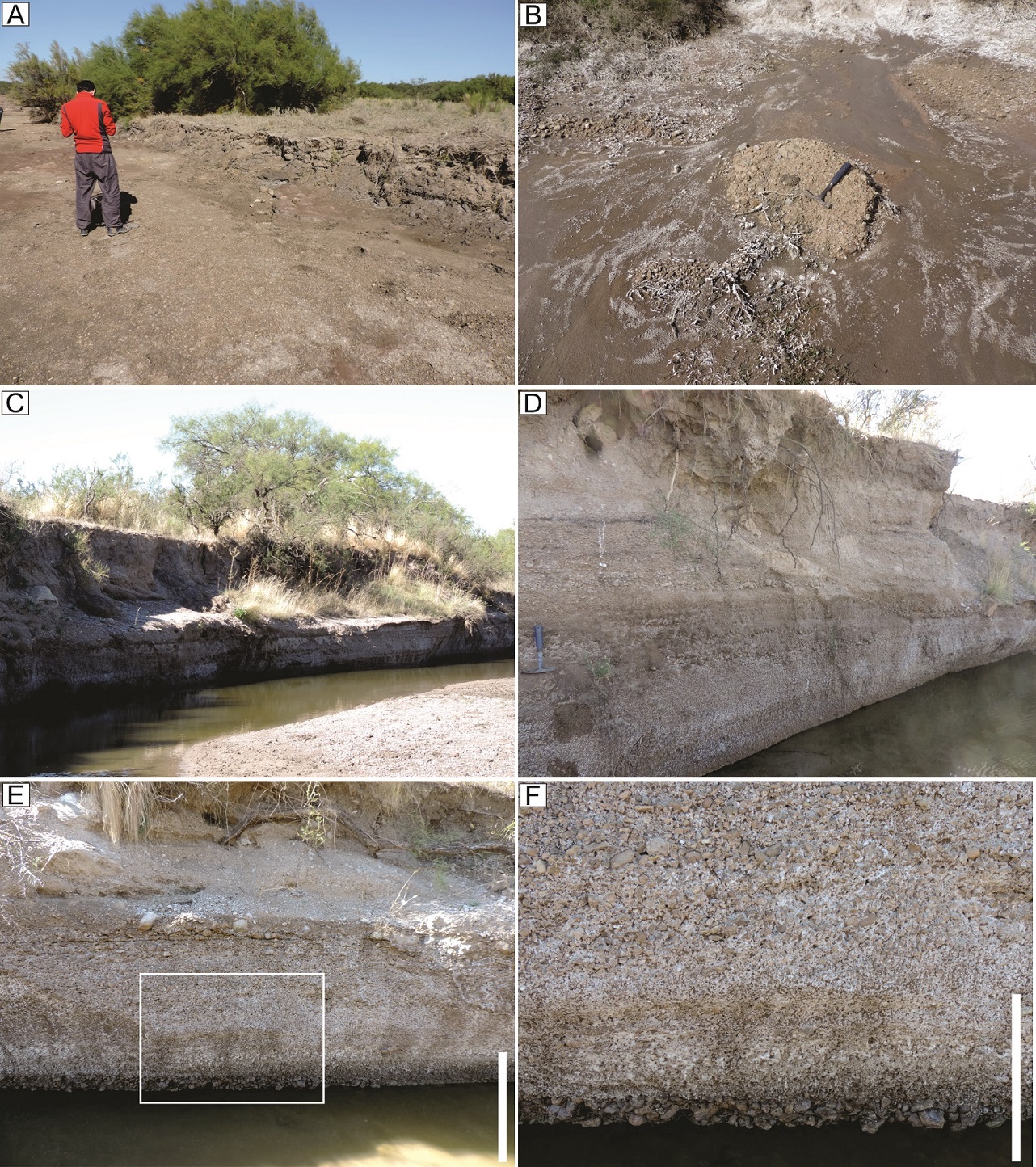 In a nearby point, here called Curva de la Vaca (38°33´31.2´´ S, 62°58´36.2´´ W; Figs. 1, 2C), ~1.7 km upstream from Arenas Blancas site, we identified a more extensive outcrop (~500 m) with deposits that also overlie the CAF in erosive discontinuity. The sequence at this point is thicker, 2-2.5 m-thick, and includes grayish brown, well-stratified sands and gravels (Fig. 2D-F); sandy siltstones intraclasts of the CAF, cemented by calcium carbonate, are common. Coarse deposits are similar to those described for the Arenas Blancas site. Overlaying these coarse levels, gray silty sands crop out (Fig. 2D). Vertebrate fossils were not recovered from this site.