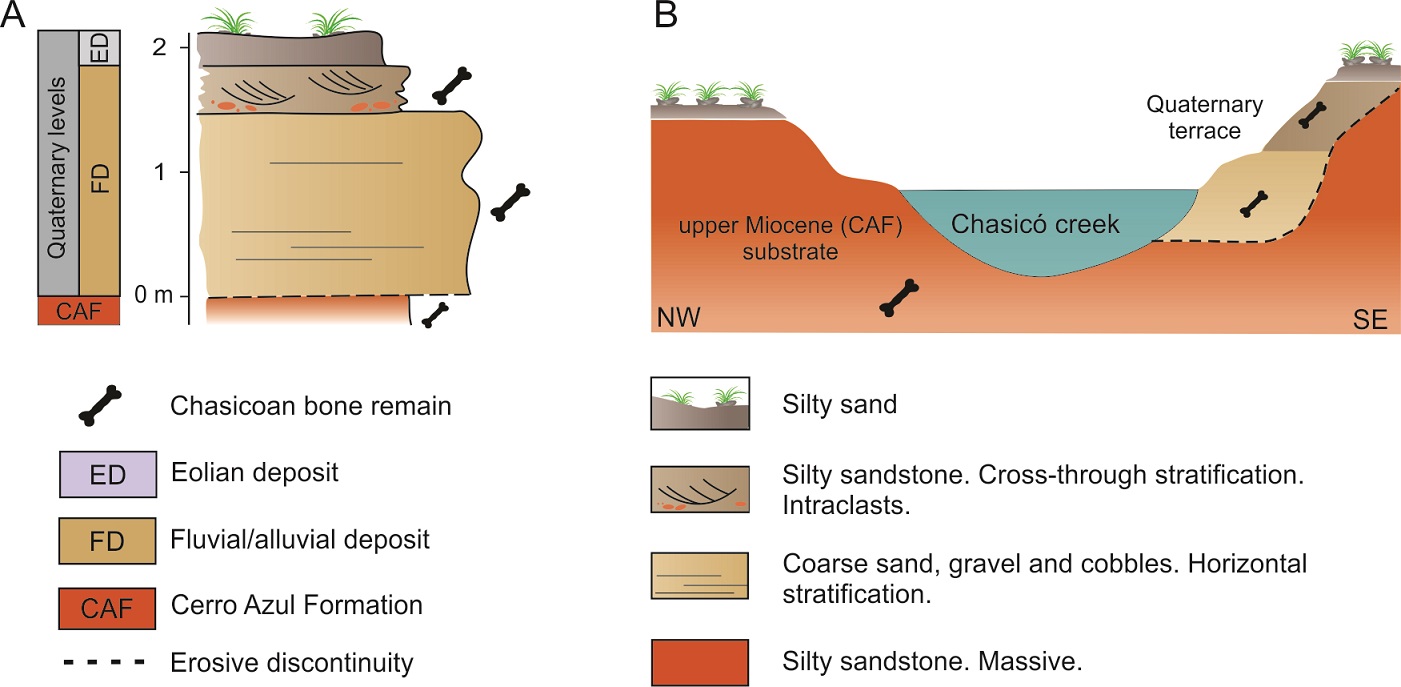 Based on the available evidence, it is proposed here that fluvio/alluvial events, occurred during the Late Pleistocene-Holocene, eroded the Upper Miocene substrate (CAF) cropping out in the Chasicó creek valley and reworked fossil remains (Fig. 3A, B). This interpretation is also supported by the presence of intraclasts from the CAF in the fossil-bearing levels and the Chasicoan affinities of the revised assemblage. Reworking processes would explain the accumulation in a small area of hundreds of skeletal remains belonging to diverse vertebrate taxa, which show very different types of preservation. Vertebrate assemblages formed by reworked specimens were reported for other Neogene fluvial deposits in the Pampean region, such as Cerro La Bota site (Cerro Azul Formation, Chasicoan Stage/Age, Late Miocene; Montalvo et al., 2022) and Farola Monte Hermoso site (Monte Hermoso Formation, Montehermosan Stage/Age, Early Pliocene; Tomassini and Montalvo, 2013).