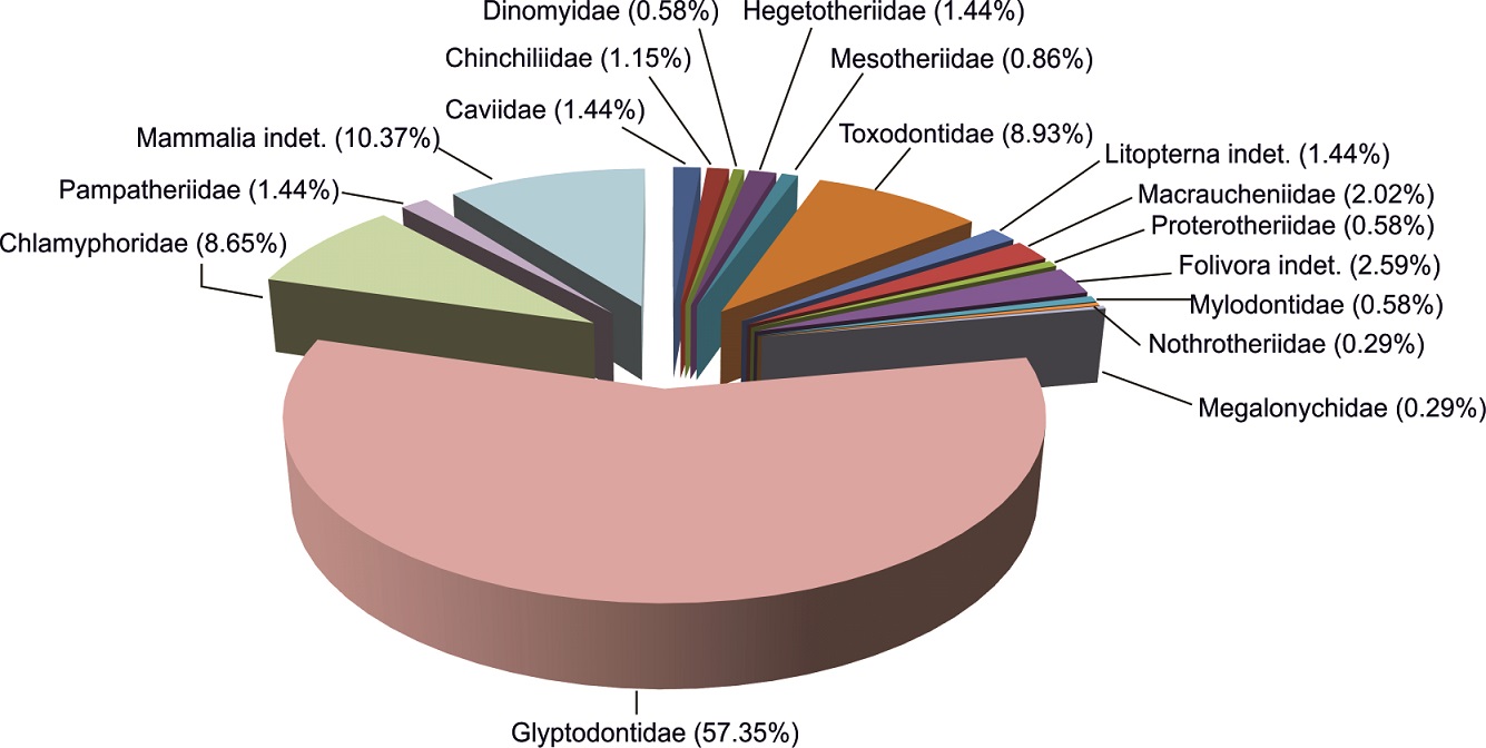 Cingulates are clearly the most abundant group, mostly represented by glyptodonts and, to a lesser extent, by chlamyphorids and pampatheriids. Their abundance is fundamentally related to the high number of dorsal carapace osteoderms.