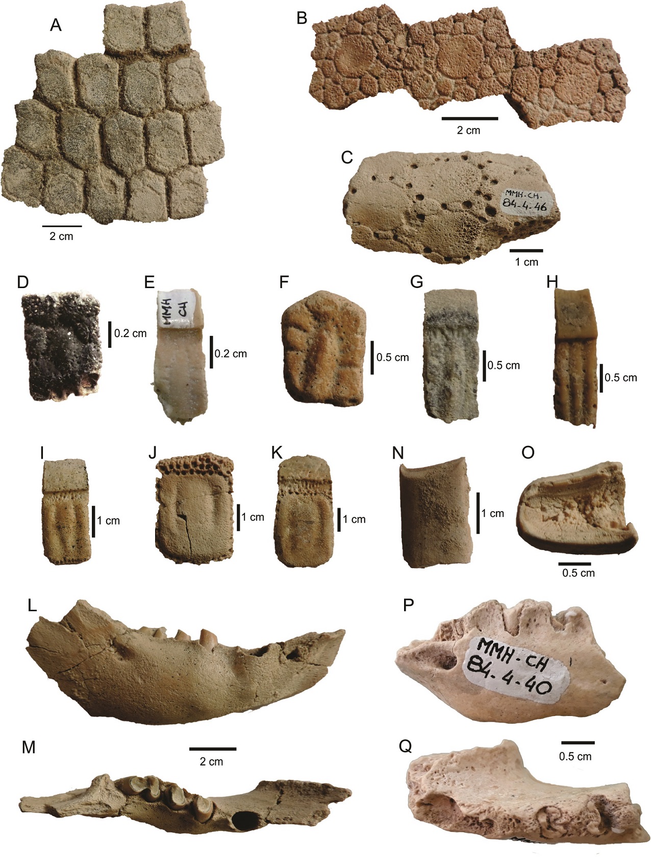 Chlamyphorids from Arenas Blancas site are represented by isolated osteoderms identified as: Euphractinae Eutatini Chasicotatus ameghinoi (Fig. 5D, E), Euphractini Macrochorobates scalabrinii (Fig. 5F, G) and Proeuphractus sp. (Fig. 5H), and the Tolypeutinae Priodontini Vetelia perforata (Fig. 5I). The holotypes and several referred specimens of C. ameghinoi and V. perforata come from the Chasicoan assemblage of the Chasicó creek. For each taxon, there are not differences in the size and ornamentation pattern between the Arenas Blancas specimens and those from Chasicoan and Huayquerian assemblages from Buenos Aires and La Pampa provinces (Scillato-Yané, 1982; Esteban et al., 2001; Urrutia et al., 2008; Scillato-Yané et al., 2010). The presence of Chorobates cf. C. villosissimus mentioned by Oliva et al. (2011; Table 1) cannot be corroborated.