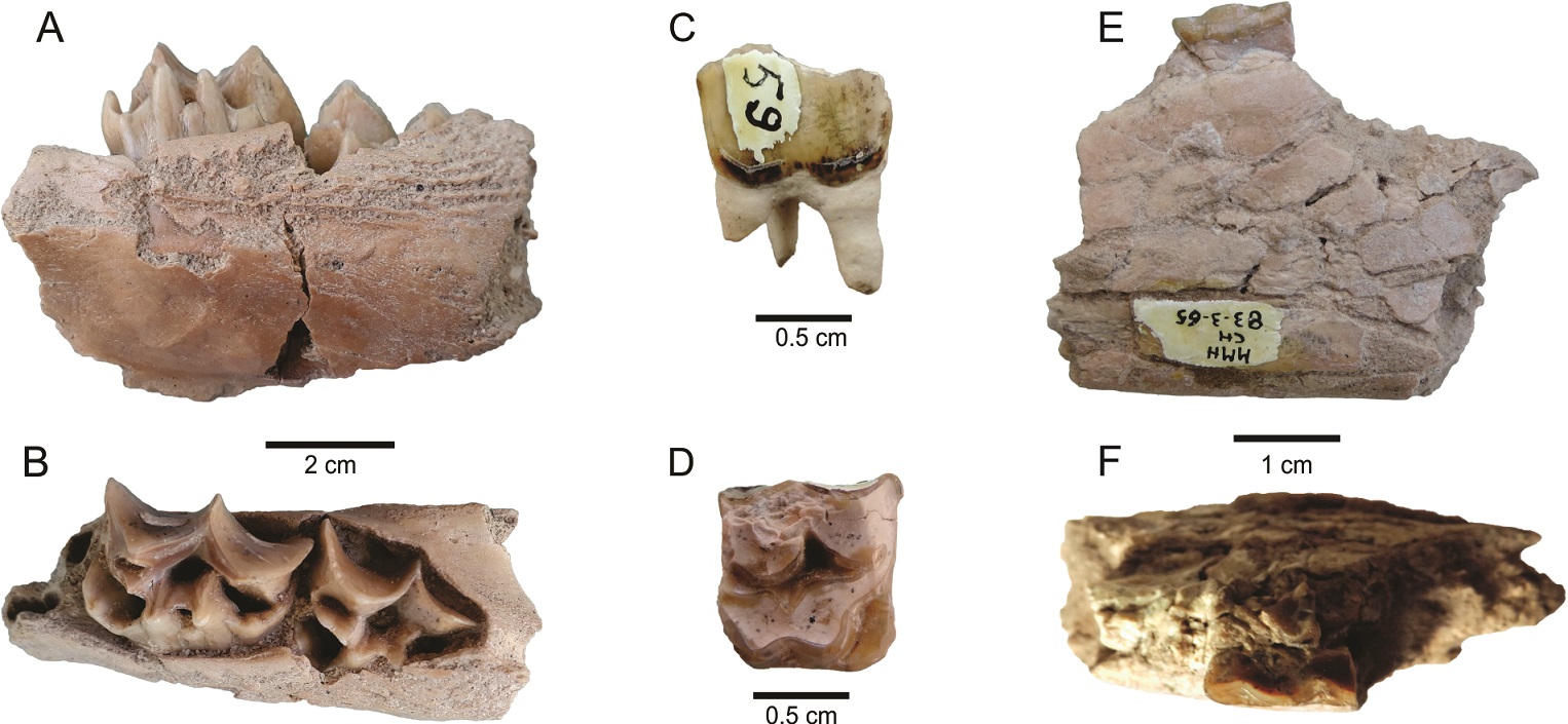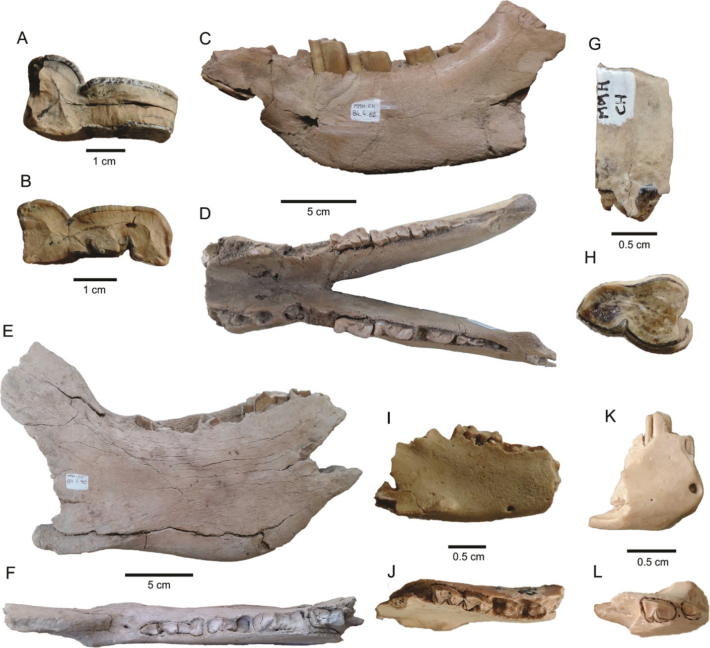 The almost complete mandible MMH-CH-88-6-71 assigned to the caviid Cardiatherium chasicoense (Fig. 6A, B) was previously referred to this species and described in detail by Deschamps et al. (2007). Isolated molariforms are assigned to Cardiatherium sp., based on their morphology and size. The species C. chasicoense is the oldest known capybara and it is considered characteristic of the Chasicoan Stage/Age (Deschamps et al., 2007, 2009, 2013; Vucetich et al., 2014). Deschamps et al. (2009) mentioned the presence of this species in levels of the Loma de Las Tapias Formation (San Juan Province) correlated with the Chasicoan Stage/Age, which represents the only known record out of the Pampean region, which allows extending this stage/age up to near 8 Ma (Deschamps et al., 2013). Cardiatherium aff. C. orientalis was mentioned for early and late Huayquerian assemblages from La Pampa Province (Deschamps et al., 2013).