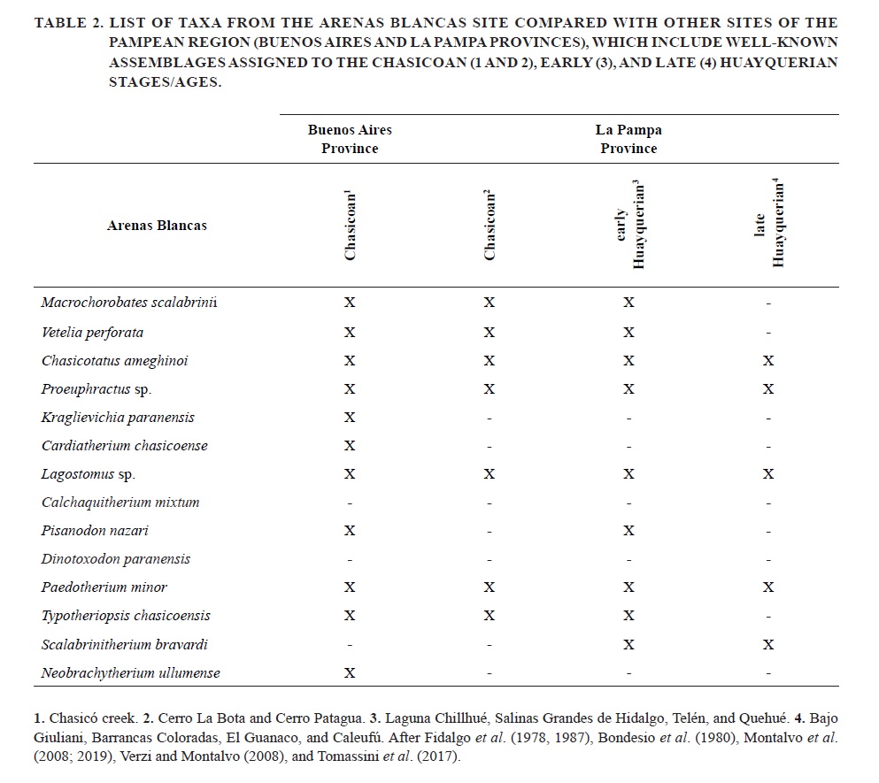 In order to adjust its age and biostratigraphy, the fauna from the Arenas Blancas site is compared with classical Late Miocene assemblages assigned to the Chasicoan and Huayquerian stages/ages from Buenos Aires and La Pampa provinces, because they are the best represented from a taxonomic viewpoint for this period (Table 2); other assemblages assigned to different lapses of the Huayquerian Stage/Age (e.g., Deschamps, 2005; Deschamps and Tomassini, 2016; Bonini et al., 2017) are not considered here because of the low number of taxa recorded from each locality.