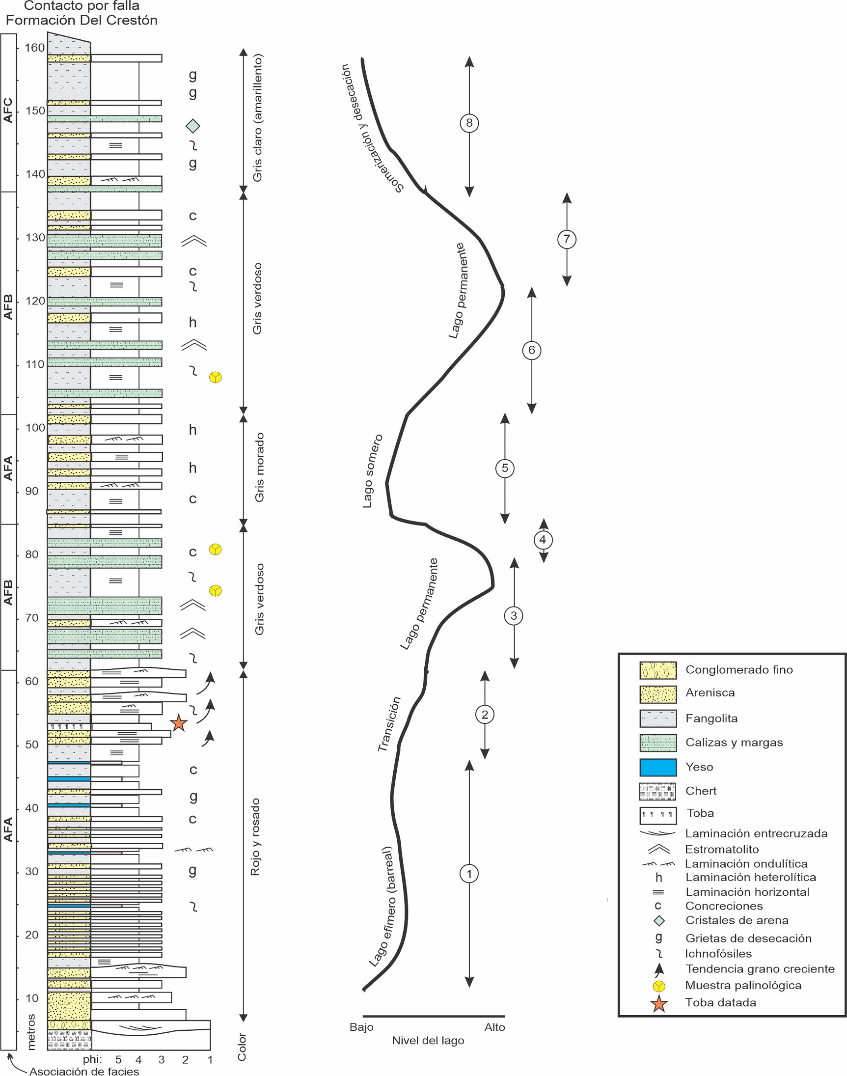 Una nueva expansión del cuerpo de agua es marcada por la segunda ocurrencia de la asociación de facies B, aunque en este caso la cantidad de niveles estromatolíticos es menor y se supone que también lo fue la productividad del cuerpo de agua (intervalo 6 en Fig. 6). Una progresiva somerización se manifiesta en el término superior de la facies B (intervalo 7 en Fig. 6), la que se acentuó en la asociación de facies C, indicando la definitiva somerización del cuerpo de agua y el probable pasaje a facies palustres en las que se intercalan fangolitas y margas (intervalo 8 en Fig. 6).
