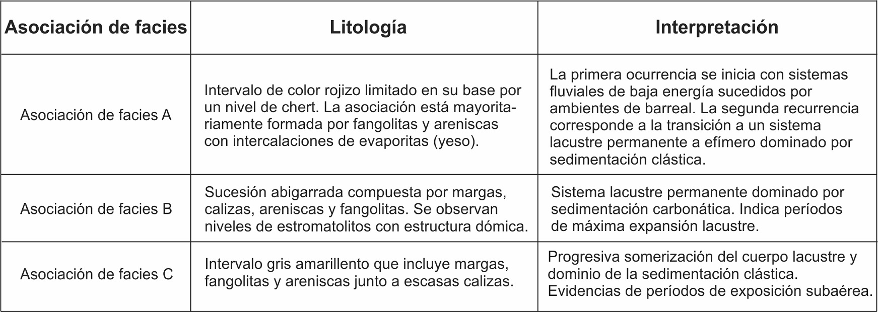- Dentro del esquema señalado la asociación de facies A es dividida genéticamente en tres tramos: a) sedimentación fluvial (base de la asociación), b) sistema lacustre efímero y c) sistema lacustre en expansión. La asociación de facies B corresponde a una marcada expansión del cuerpo lacustre, asociada a un incremento en la sedimentación carbonática respecto a la clástica, y a un aumento en la actividad biológica que probablemente indica un mejoramiento climático. Finalmente, la asociación de facies C evidencia una progresiva desecación del cuerpo lacustre y el pasaje a facies de planicie arenosa de lago efímero.