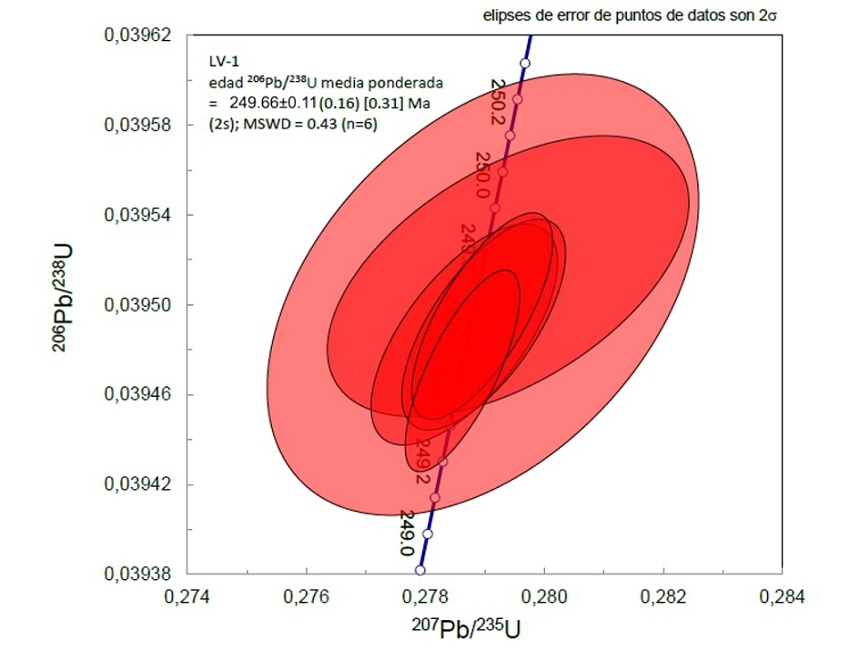 FIG. 10. Diagrama concordia para los zircones del nivel de toba (LV-1) contenidos en la asociación de facies A (para ubicación en el perfil véase la Fig. 6). Cada zircón está representado por sus elipses de error.