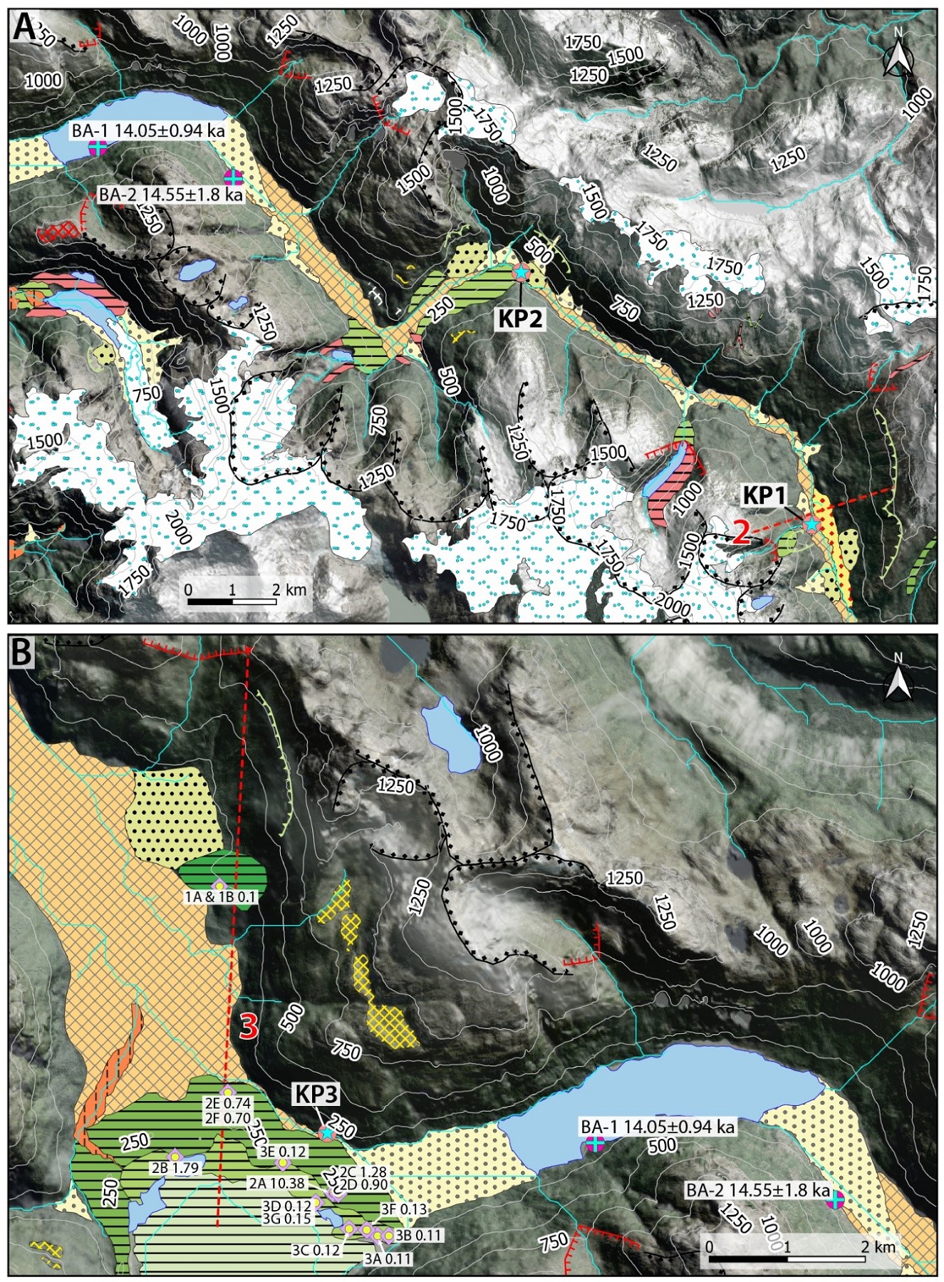 Fig. 3. Geomorphological map of the Bayo River Valley (BRV). A. Lower segment of the BRV. B. Exploradores Valley. Legend is shown on figure 2. Radiocarbon ages in moraines of the Exploradores Glacier (Aniya et al., 2007) calibrated using the OxCal 4.4 program and SHCal20 terrestrial calibration curve (Hogg et al., 2020). 2A to 2F radiocarbon ages shown represent the median calibrated age and are expressed in cal. ka BP. More recent ages (<300 yrs; 1A-1B and 3A-3G) are expressed in ka BP.