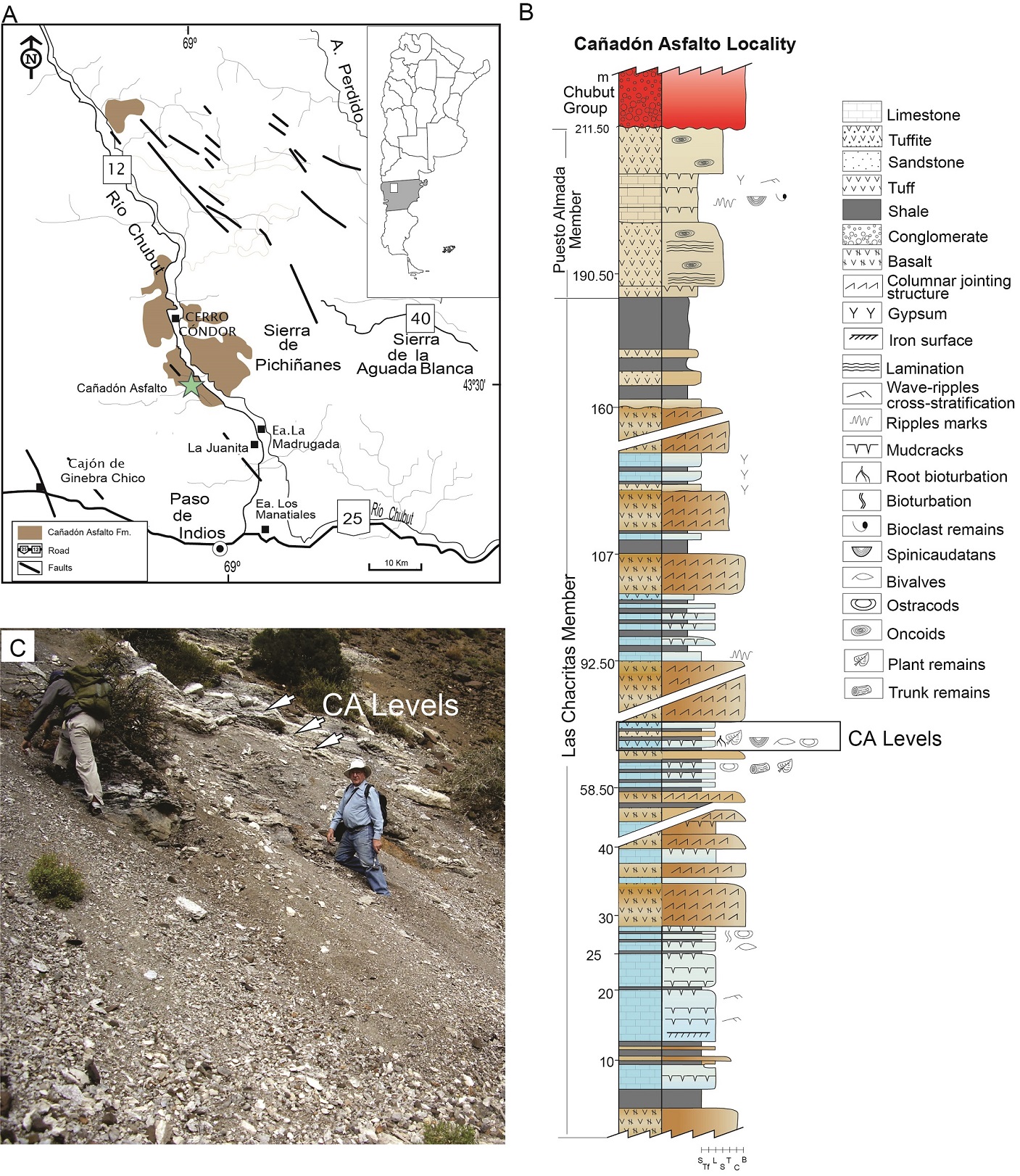 Fig. 1. Cañadón Asfalto locality. A. Geological map and location of the Cañadón Asfalto creek in the Cerro Cóndor Sub-basin (green star), central Chubut Province. B. Stratigraphic section of the Las Chacritas Member (Cañadón Asfalto Formation) in Cañadón Asfalto locality, modified from Cabaleri et al. (2010b). CA are the fossiliferous levels. C. Field view of the fossiliferous levels at Cañadón Asfalto locality, these are tuffitic layers (ca. 5 m thick) interbedded with shale.
