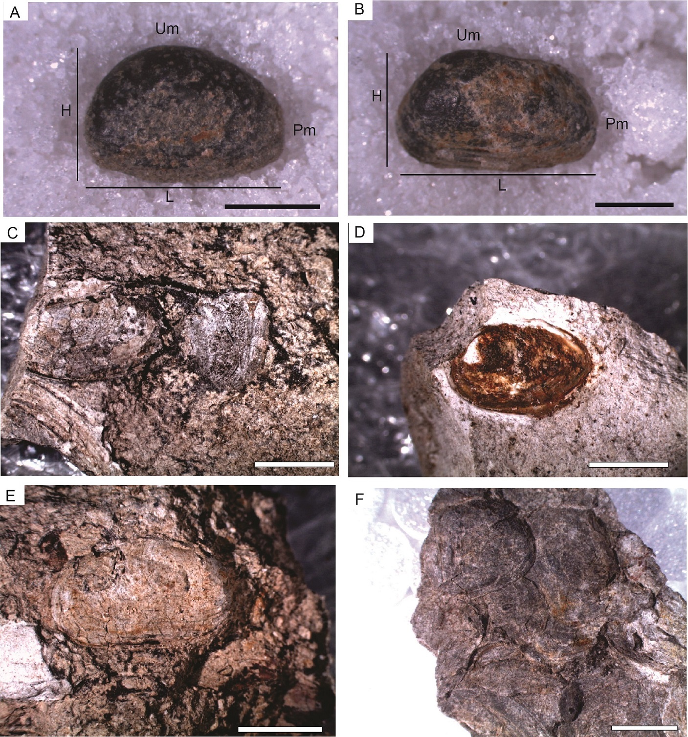 The specimens are small-sized, length is between 7.6 and 11.7 mm and height between 5.2 and 7.6 mm (height/length ratio 0.56-0.88). The anterior margin is rounded, the posterior one obtusely pointed; the ventral margin is straight or slightly concave, the dorsal one nearly straight or slightly arched. The umbo cannot be distinguished in most specimens because of the type of preservation; when they are visible, they are situated at about ¼ of the shell length from the anterior end, and do not protrude from the dorsal margin. The shape resembles that of modern unionids; however, the absence of distinctive characters, such as hinges, sculpture, or muscle impressions, prevents a formal determination. At least two morphotypes has been recognized based on shape and height/length (H/L) variation. Morphotype 1 (M1) has suboval or subcircular-subtriangular outline with a convex ventral margin, the anterior margin being rounded and the posterior one with a marked angle (Fig. 3A). Morphotype 2 (M2) is transversely elliptical, with a slightly straight dorsal margin and sharp anterior margin (Fig. 3B).