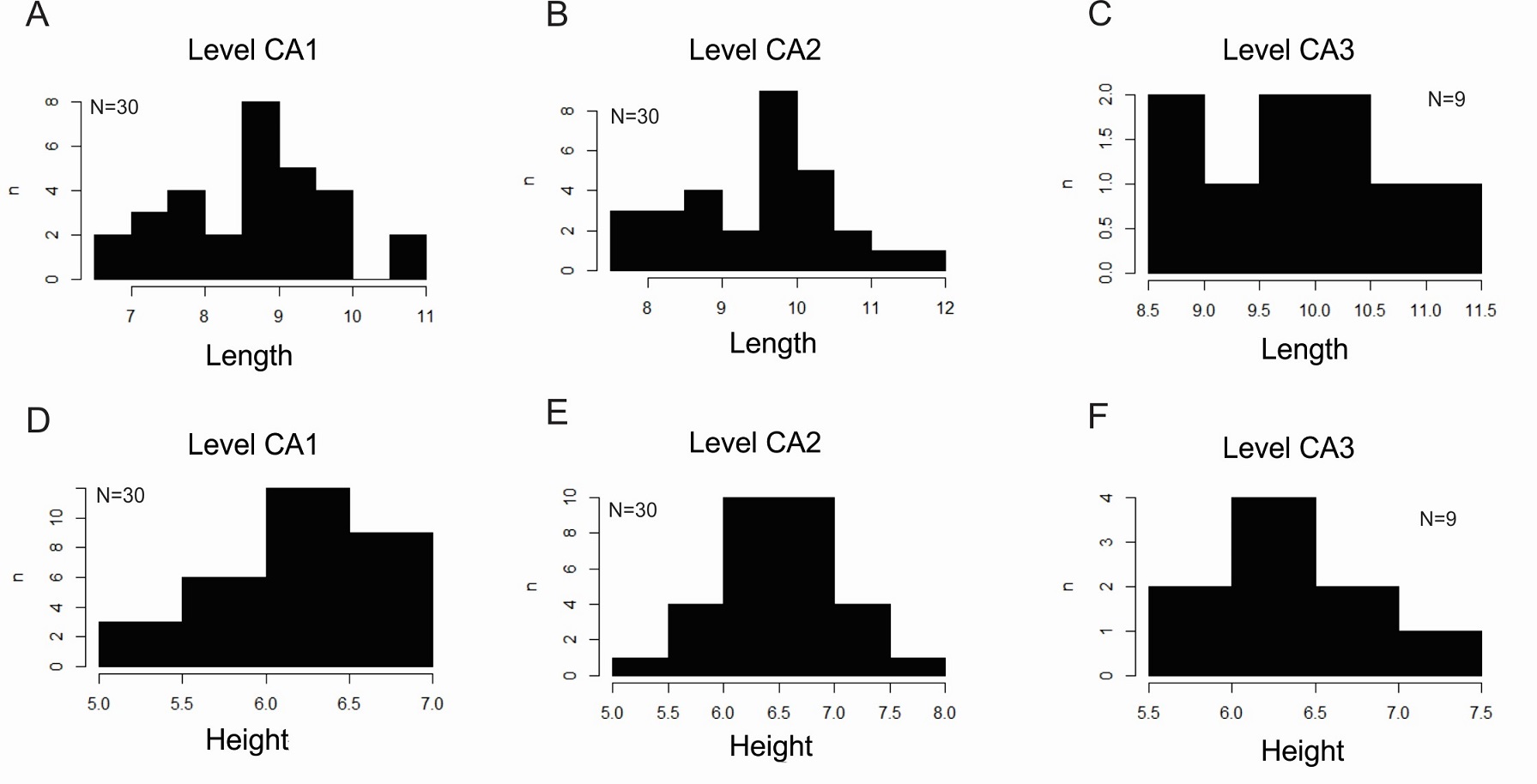 Fig. 4. Size-frequency distribution of length (A-C) and height (D-F) ratios from Cañadón Asfalto locality, using R program.