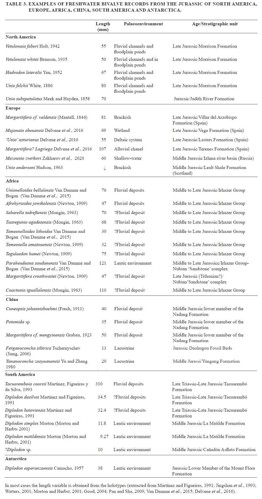 Table 3 shows unionid species recorded from fluvial deposits or sandy substrates in different Jurassic basins, where they are mainly large, more than 30 mm in length. North America, Europe and Africa contain larger forms compared to China, Antarctica, and South America species. Tacuaremboia caorsii from Uruguay is the only giant species from South America; the unionids from Argentina are characterized by small forms, less than 15 mm in length (Cañadón Asfalto and La Matilde formations). Cardinioides lanesae appears in lagoonal facies with frequent changes in salinity, suggested by a trapezoidal globose shell with posterior umbonal carina and a truncated posterior margin (Damborenea and Lanés, 2007). Species from Jurassic and Lower Cretaceous of northeastern China show frequently small sizes (ca. 10 mm) recorded in lacustrine deposits (Fürsich and Pan, 2016). Cuneopsis johannisboehmi shows a wide range of sizes (15-68 mm long) where the smallest specimens are 15 mm long and 9.5 mm high. Therefore, the bivalve freshwater fauna from Patagonia described here show the smallest-sized association of unionids recorded for the Jurassic time.
