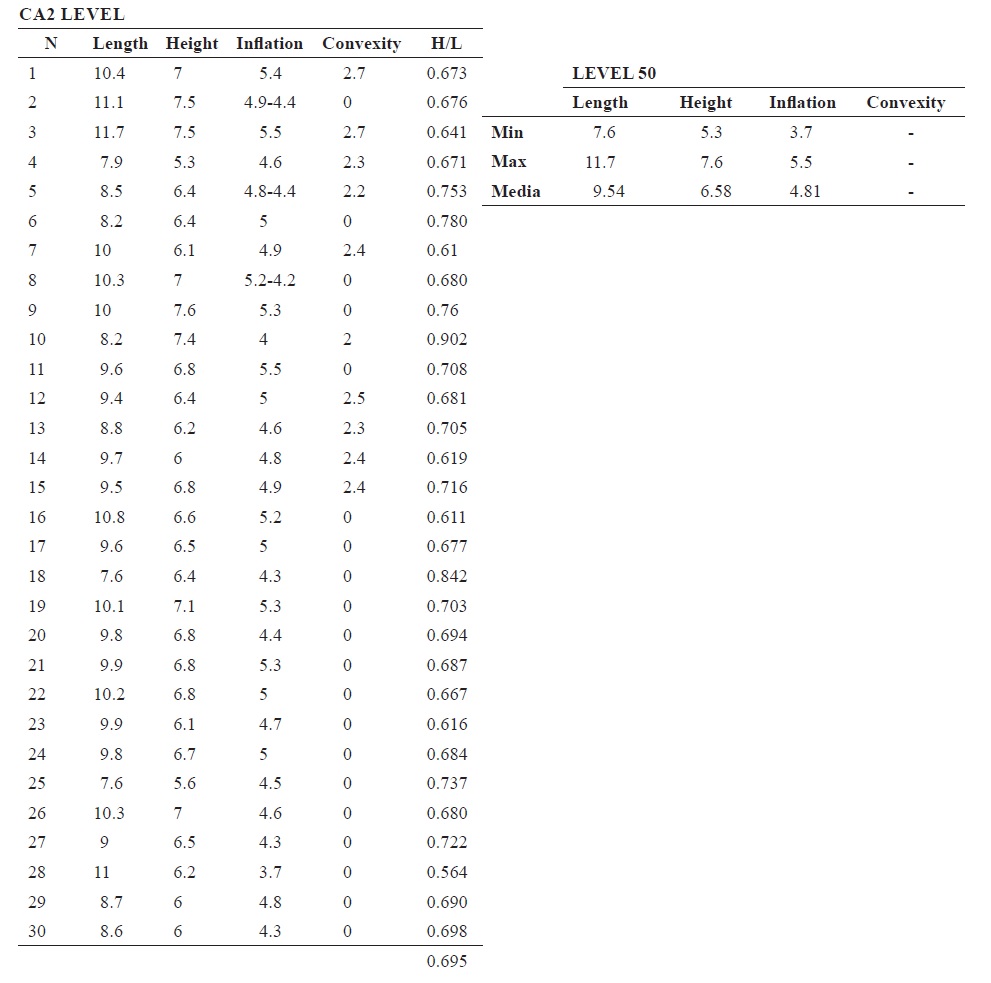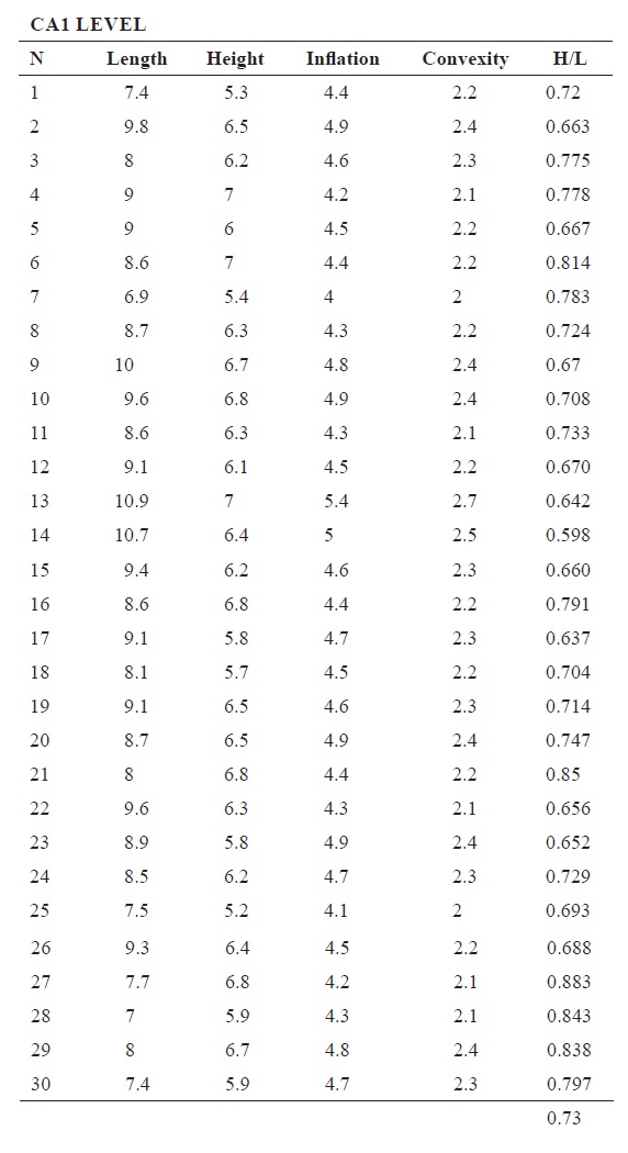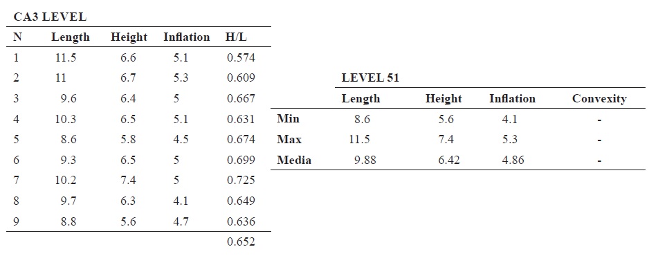 2. We compared length and height between levels through the Kruskal-Wallis test and ANOVA. Kruskal-Wallis results show that there is a significant difference between sample length medians and H/L relationship (p >0.05). ANOVA results indicate the same results of length medians relationship (Table 2).