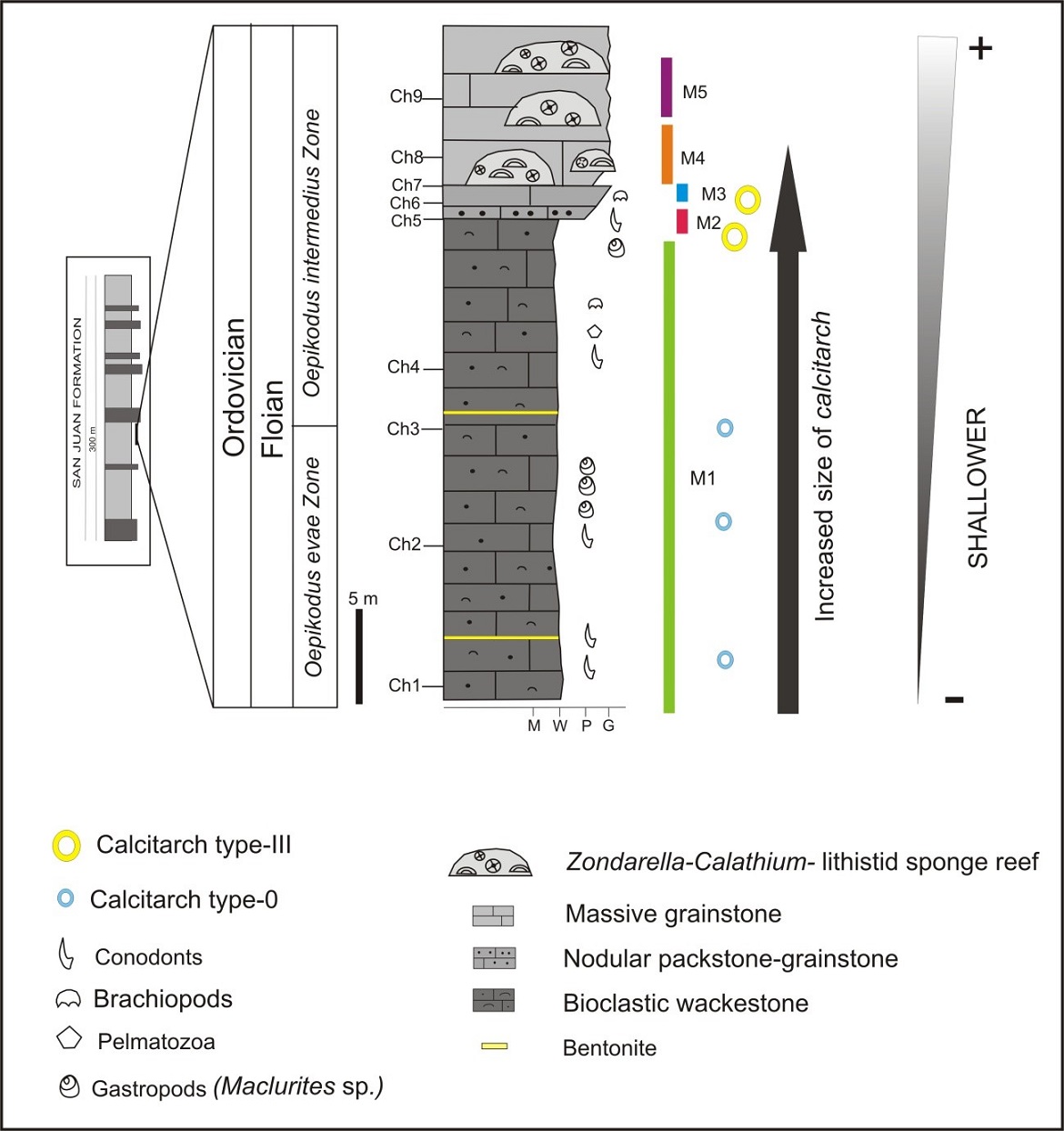 The studied stratigraphic range begins with fine facies represented by burrowed bioclastic wackestone (M1) that has been deposited in low-energy conditions. In this facies only the type-0 calcitarch is present. The presence of carbonate mud indicates low energy conditions below fair weather waves within a shallow inner platform setting. Then, the peloidal intraclastic packstone-grainstone (M2), intraclastic floatstone (M3), intraclastic wackestone-packstone (M4) and bioclastic boundstone (M5) facies indicate high energy conditions, suggesting a shallow subtidal environment within the inner high-energy platform associated with shoal and reef facies. In these beds the type-III calcitarch is recorded. The variation in the size of the calcitarch recognized along the studied sections could be related to a gradual increase of energy within a shallow subtidal environment, from distal to proximal, including from shallow subtidal facies below wave action to shoal and reef facies. This could be interpreted as a reflect a gradual shallowing-upward evolution as it was proposed by Soria et al. (2017) and Mestre et al. (2020) for coeval levels of San Juan Formation from the Niquivil and Talacasto sections.