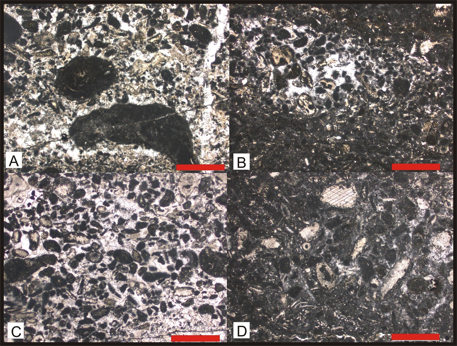M4-Intraclastic wackestone-packstone (Ch8 sample) is dominated by subrounded, elongated and irregular intraclasts with a size of 0.2-1.5 mm. It also comprises skeletal components surrounded by micritic envelopes, Girvenella raft and Halysis moniliformis Høeg (Fig. 7).