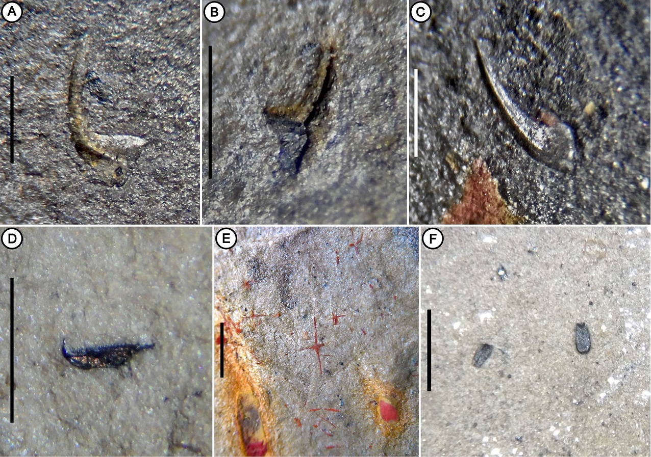 The studied material comes from the Salto Macho Member, La Chilca Formation, at the Poblete Norte section. The graptolites were collected from samples PN-011.5, PN-012 and PN-014 (Fig. 2). Several conodont elements were found at PN-008/009, PN-011.5, and PN-012. The graptolite assemblages include nine graptolite and retiolitid taxa (Figs. 3 and 4), and unknown biserial and monoserial colonies. The tubaria were observed on bedding planes together with conodont elements (Fig. 5A-C), scolecodonts (Fig. 5D), spicules (Fig. 5E), and quitinozoans (Fig. 5F). The studied specimens are housed in the Instituto de Geología Dr. Emiliano Aparicio, Facultad de Ciencias Exactas, Físicas y Naturales, Universidad Nacional de San Juan, under the repository codes INGEO-PI-1835/1908-1919/1921-1934.