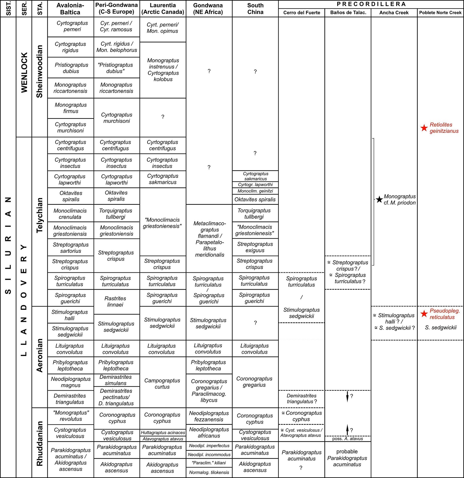 In agreement with the biostratigraphic chart proposed by Loydell (2012), the presence of the S. sedgwickii Zone allows to correlate the studied strata from the La Chilca Formation, with sections from Avalonia, Baltica, Peri-Gondwana, Laurentia, and NE of Africa (Fig. 6).