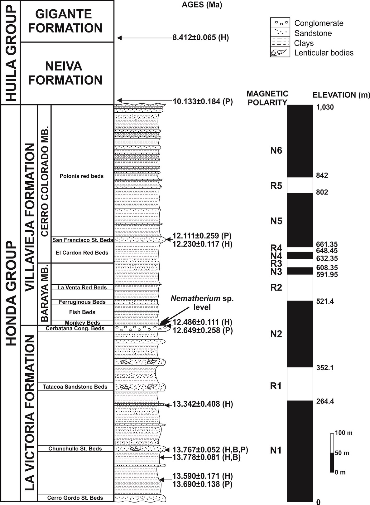 The Villavieja Formation is mainly composed of reddish to greyish mudstones, arranged into very thick levels with an occasional alternation of thin sandstone levels, which are essentially composed by volcanic litharenites. The formation is subdivided into the lower "Baraya Member", mainly composed of grey mudstones, and the upper "Cerro Colorado Member", which also includes red mudstones (Polonia Red Beds). Most part of the fossiliferous richness of this formation is restricted to the lower levels of the Baraya Member. Marker levels of the Villavieja Formation include, from bottom to top: "Monkey Beds", "Fish Beds", "Ferruginous Beds", "La Venta Red Beds", "El Cardon Red Beds", and "San Francisco Sandstone Beds" (Fig. 2). Guerrero (1997) carried out a detailed magnetostratigraphic study together with several 40Ar/39Ar dating, concluding that the whole Honda Group sequence spans from ~13.5 to 11.5 Ma, with the limit between the La Victoria Formation and the Villavieja Formation at ~12.48 Ma.