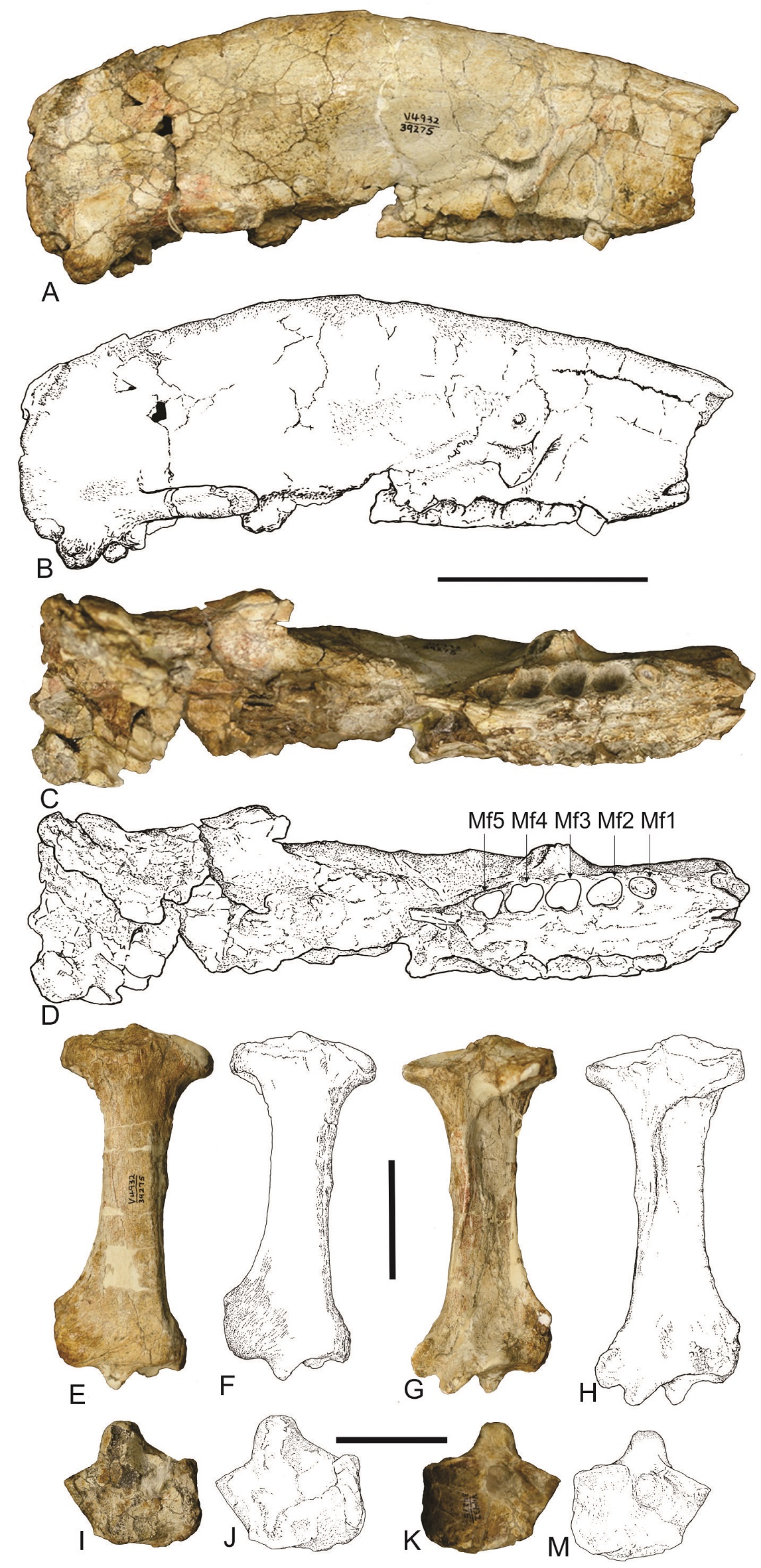 The skull is complete on the right side except for the premaxilla, pterygoid, and zygomatic arch; the right Mf1 is preserved; no sutures can be seen between the squamosal and the parietal and frontal, suggesting it is an adult specimen (Fig. 3A-D).