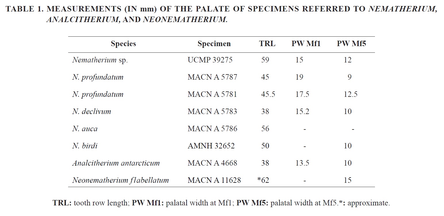 The present study of UCMP 39275 identifies similar features with those present in the species of Nematherium and dissimilar ones with Neo. flabellatum: 1) the skull roof at the level of the parietal is convex as in N. profundatum, N. birdi, and N. auca; 2) the palatal margin is almost horizontal and slightly dorsal toward the predental region, as in N. profundatum, N. auca, N. birdi, whereas in Neo. flabellatum is convex; 3) the alveolus of Mf2 is subtriangular in cross section as in N. profundatum, N. auca, N. declivum, N. birdi,whereas in Neo. flabellatum is triangular with a deep vertical lingual furrow that defines two lingual lobes; and 4) the alveolus of Mf5 is subtriangular as in N. profundatum, N. auca, N. declivum, and N. birdi,whereas in Neo. flabellatum is triangular with a convex labial side.