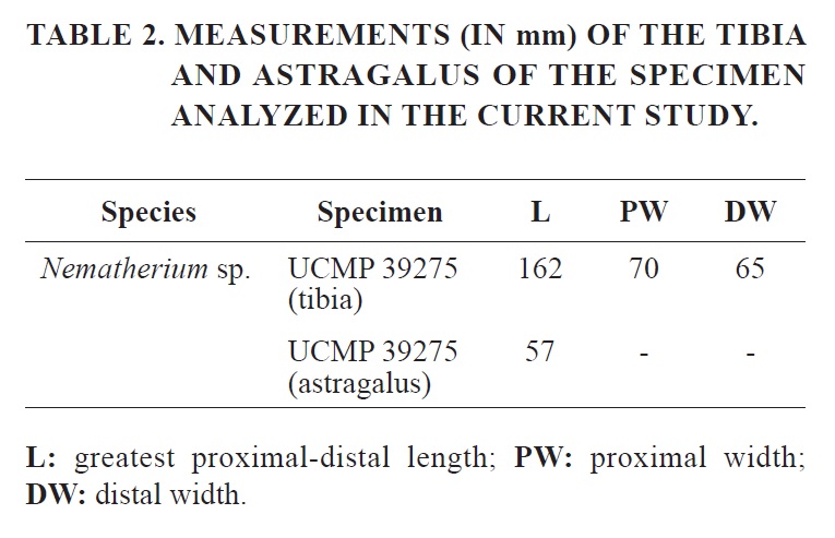 The above-mentioned similarities with the species of Nematherium suggest here the inclusion of UCMP 39275 in Nematherium; however, given such similarities are nearly present in all the species of the genus, the assignment of UCMP 39275 to Nematherium sp. is appropriate.