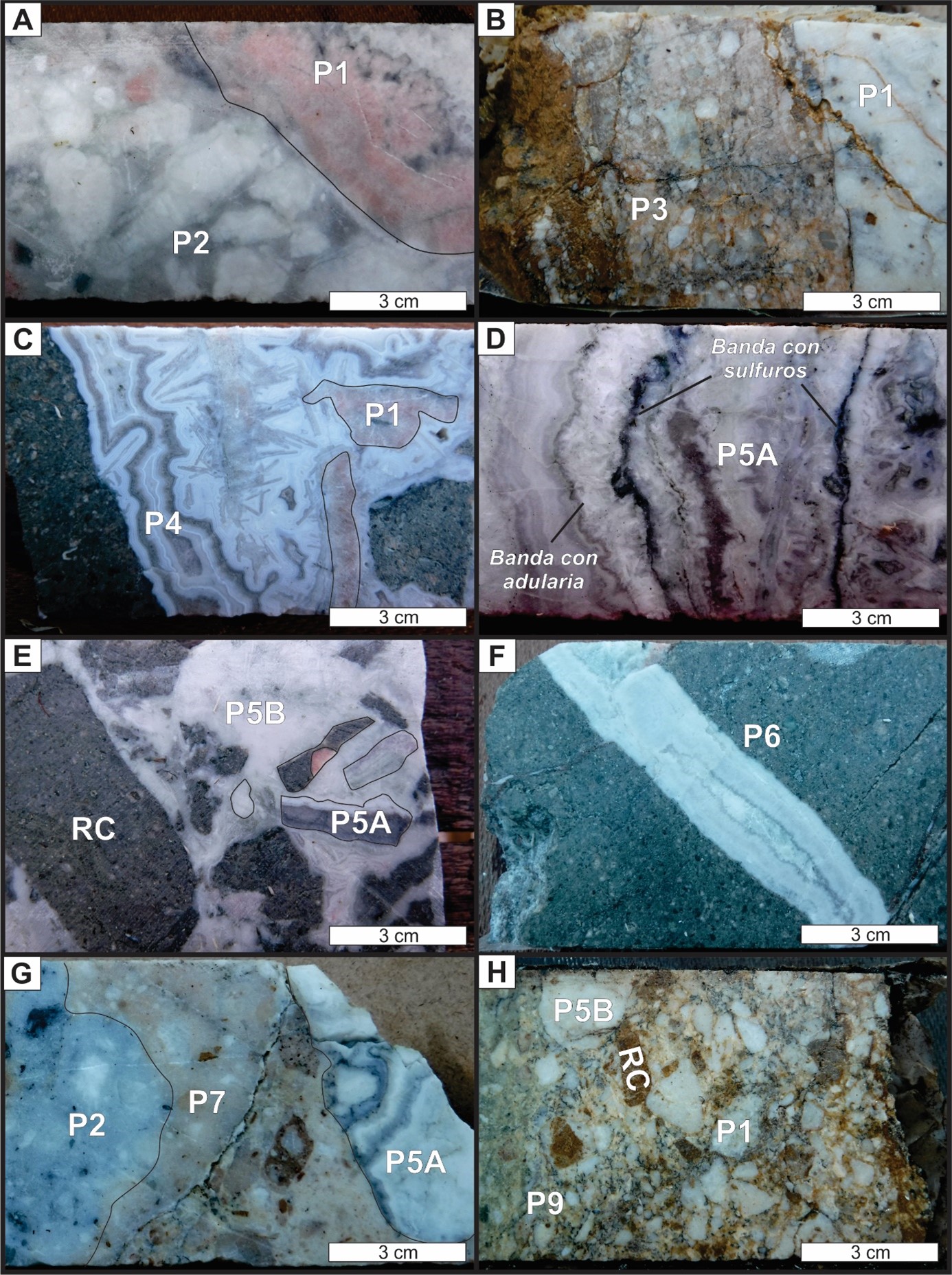 Pulso 5A (P5A): presenta un bandeado coloforme calcedónico fino de tonalidad gris verdosa, con alternancia de bandas de cuarzo, sílice amorfa con pequeños cristales de adularia (de hábito rómbico y tabular) y bandas negras de sulfuros tipo ginguro bands (e.g., Izawa et al., 1990), acompañadas por arcillas verdes (Fig. 5D). En ocasiones, presenta texturas en enrejado del tipo lattice bladed. Las altas leyes de Au y Ag se asocian mayormente a este pulso.
