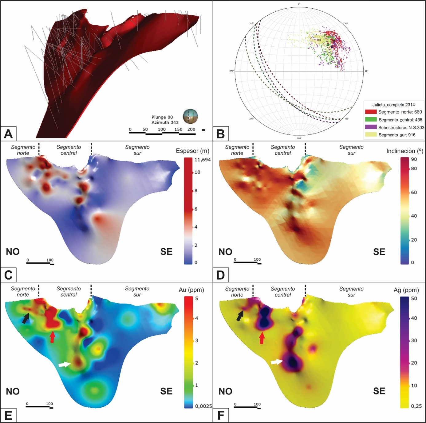 En la figura 6A se presenta el modelado del cuerpo 3D de la veta Julieta. Al graficar los datos estructurales de la veta en un diagrama de polos (Fig. 6B), se observa que los tres segmentos exhiben una marcada orientación NO-SE (rumbo promedio N315°), independientemente de alguna pequeña variación que pueda mostrar el segmento central (desde E-O a N-S).