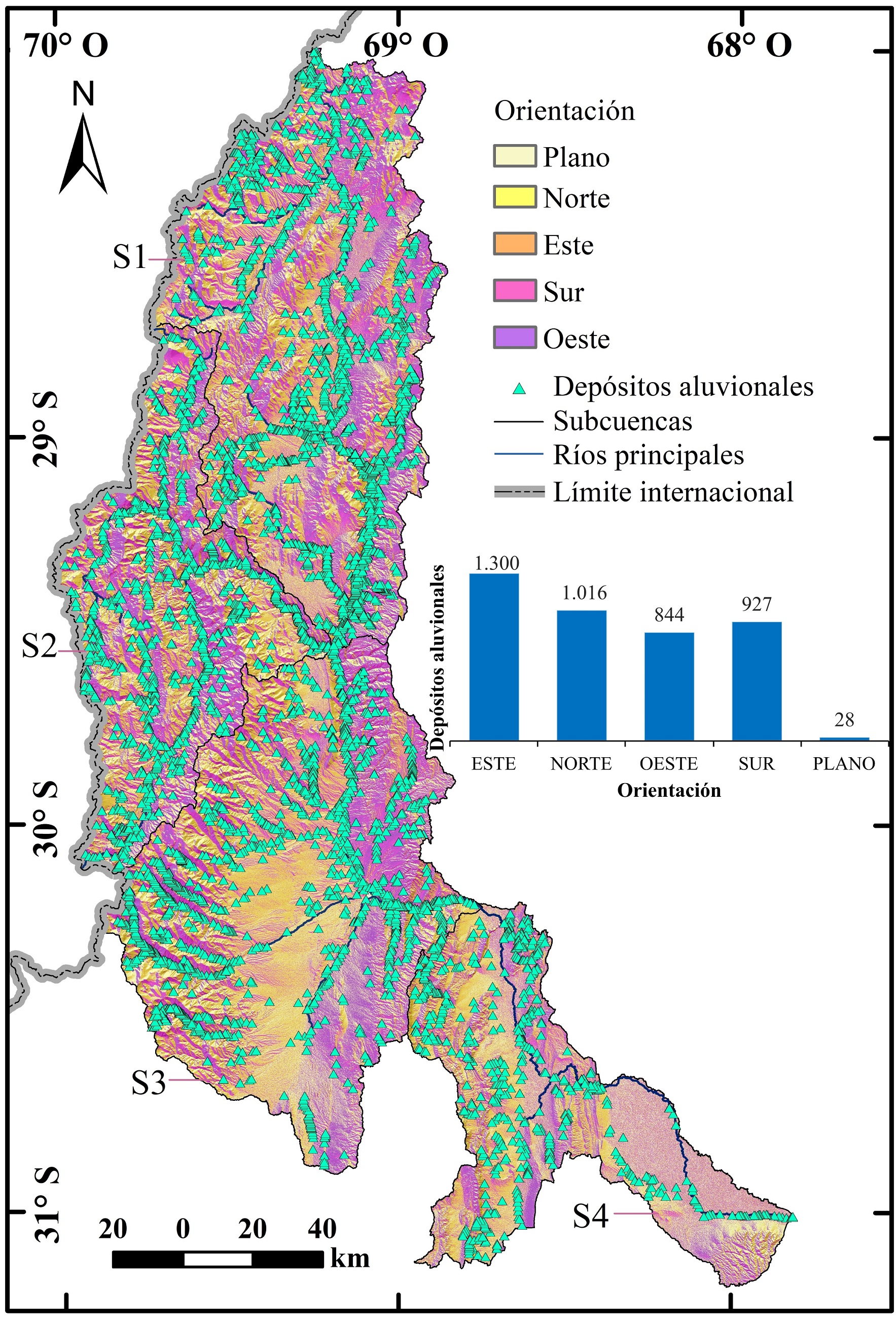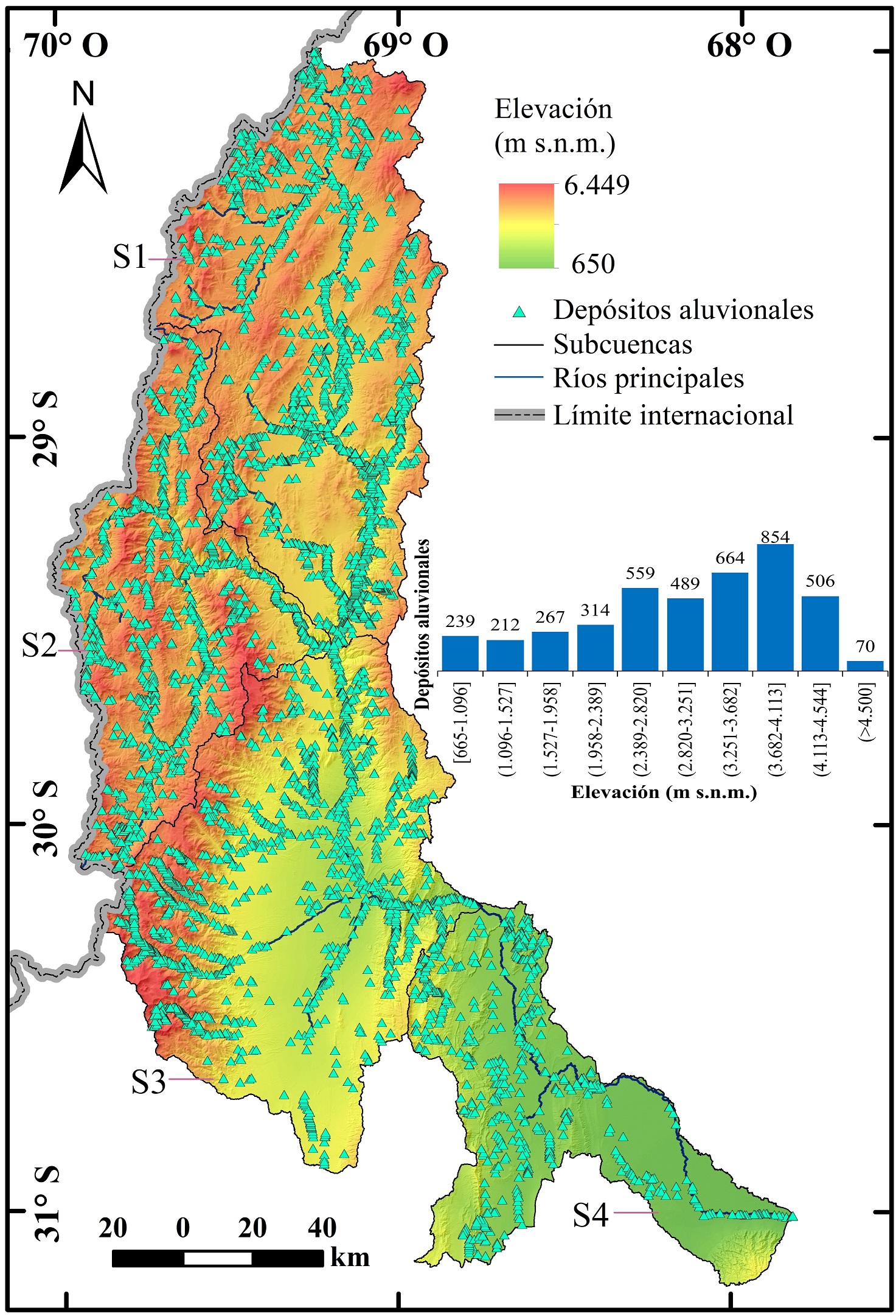 La cuenca del río Jáchal presenta una elevación máxima de 6.449 m s.n.m. y una elevación mínima de 650 m s.n.m. La elevación máxima se encuentra en la subcuenca S1 y la mínima en la subcuenca S4 (Fig. 8). La mayor concentración de depósitos aluvionales (3.072, ~73,5% del total) se distribuye entre los 2.389 y los 4.544 m s.n.m. (Fig. 8). Estos se encuentran en su mayoría asociados a pies de laderas.