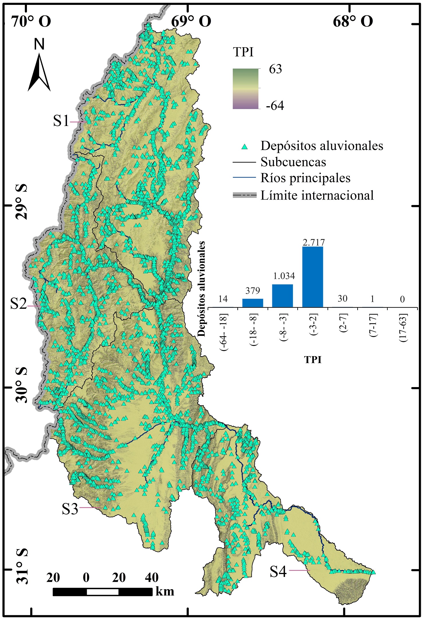 Con respecto al índice de posición topográfica (TPI), los valores positivos se manifiestan en zonas de crestas, picos de montañas y sierras (Fig. 12). Los valores negativos coinciden con zonas de quebradas y sobre los cursos de ríos. Zonas de pampas o llanos, márgenes de ríos y zonas de media ladera o bajada pedemontana presentan valores cercanos a 0. La mayoría de los depósitos aluvionales en la cuenca del río Jáchal (3.751, ~90% del total) poseen valores de TPI entre -8 y 2 (Fig. 12).